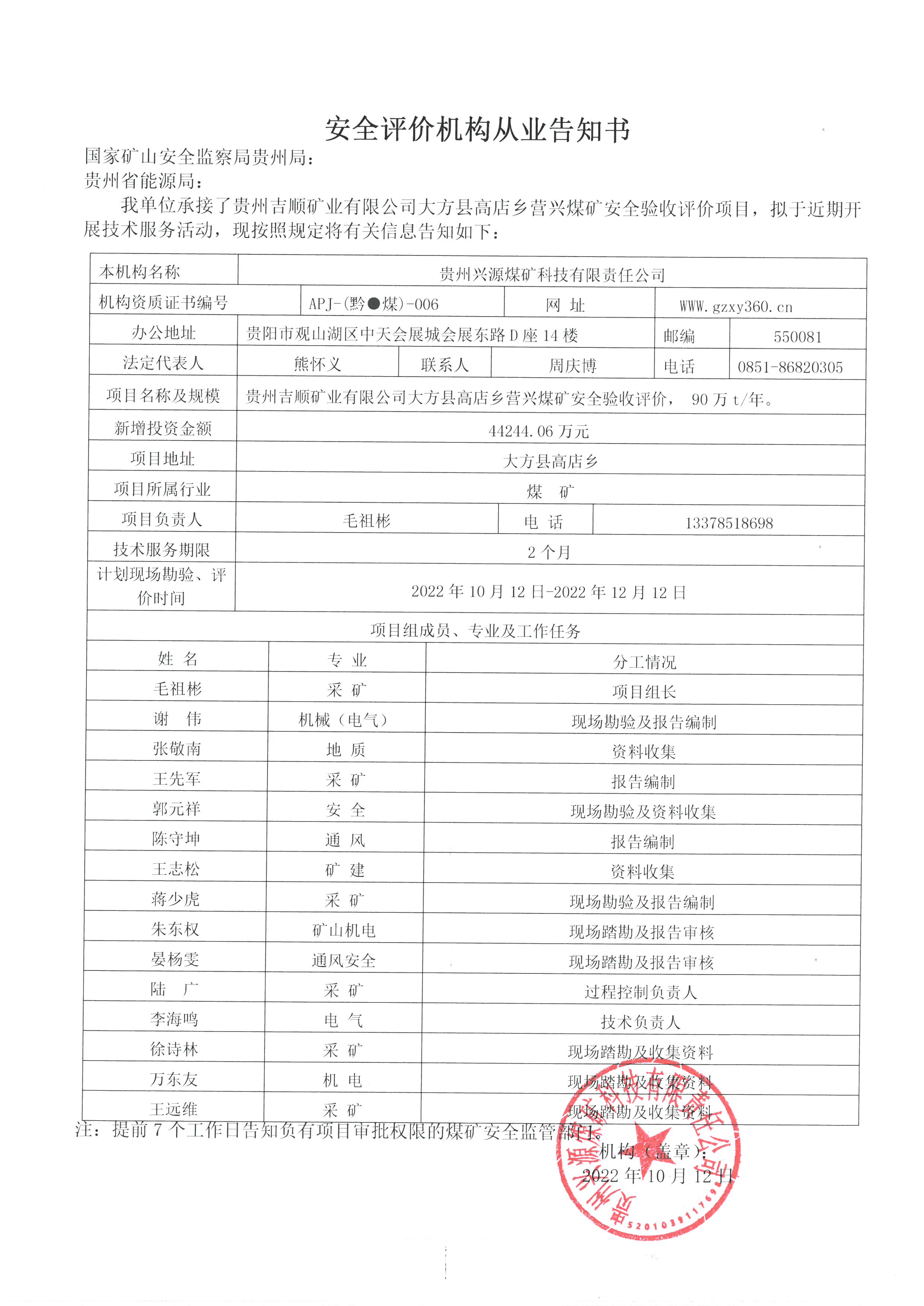 安全評價機構從業告知書【貴州吉順礦業有限公司大方縣高店鄉營興煤礦安全驗收評價項目】