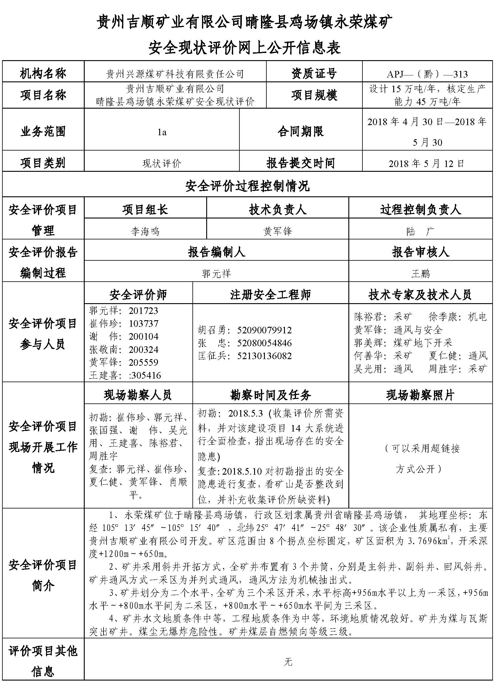 貴州吉順礦業有限公司晴隆縣雞場鎮永榮煤礦安全現狀評價網上公開信息表
