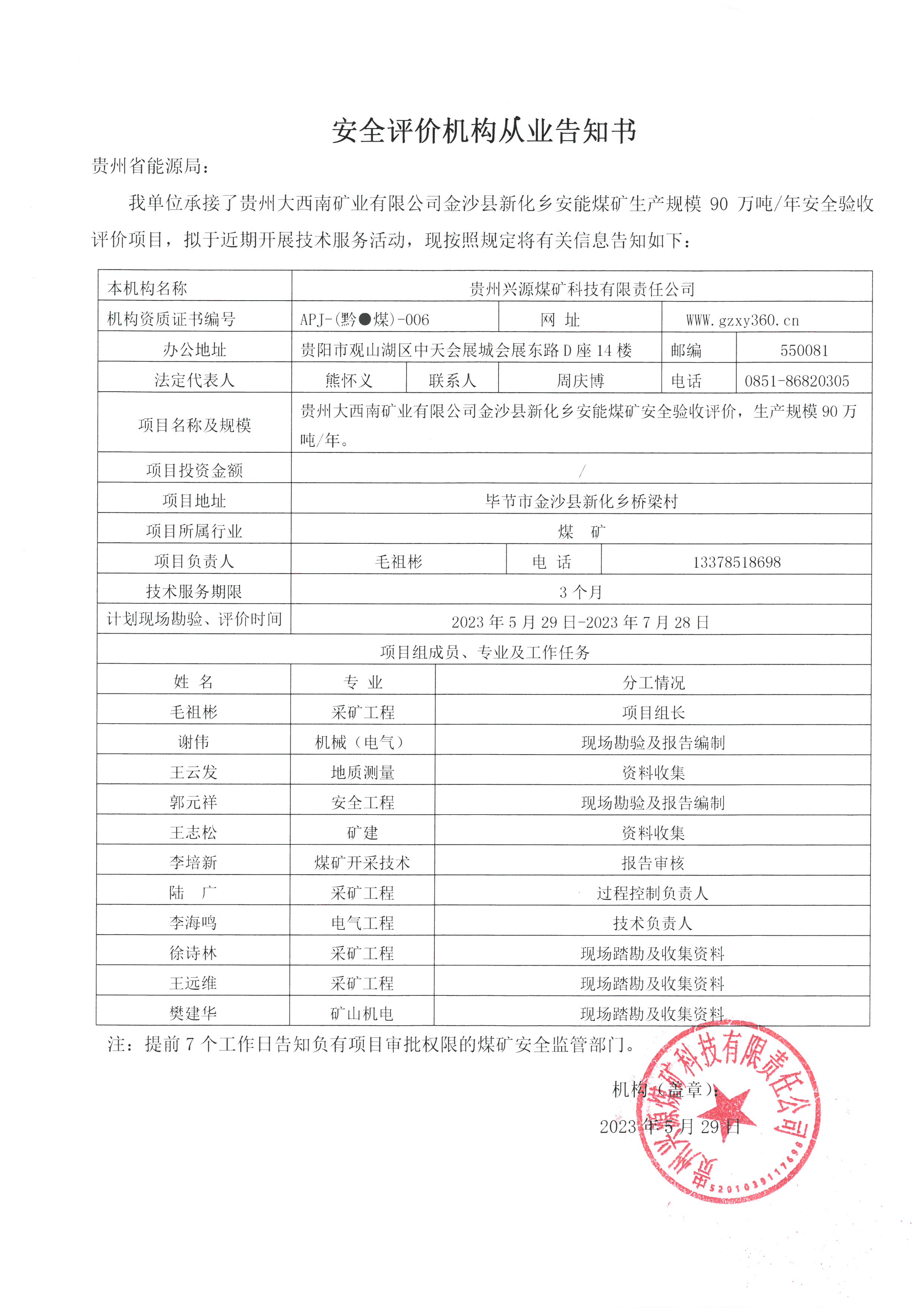 職業病危害評價機構從業告知書[貴州未來礦業有限公司織金縣城關鎮富祥煤礦]