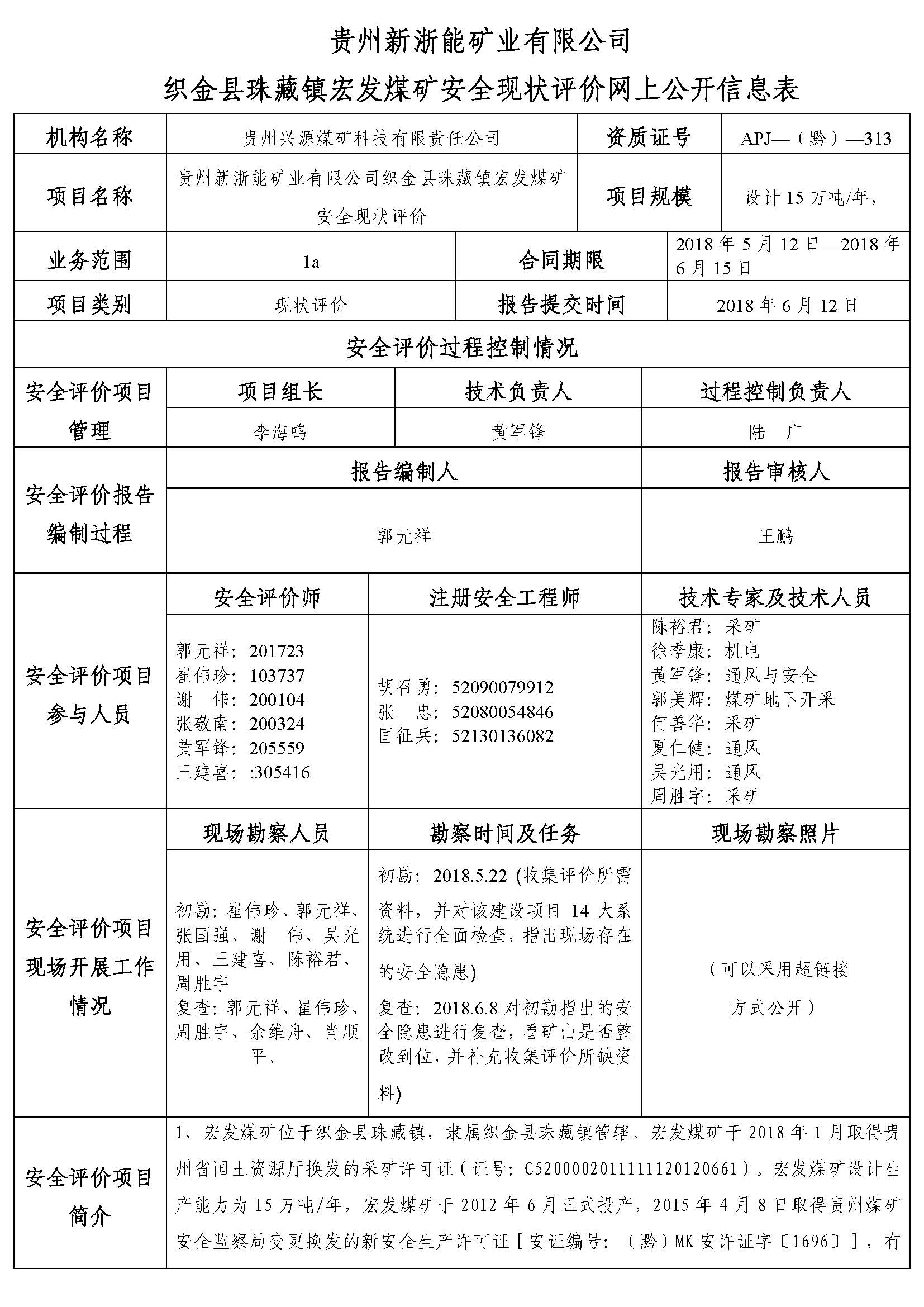 貴州新浙能礦業(yè)有限公司織金縣珠藏鎮(zhèn)宏發(fā)煤礦安全現(xiàn)狀評價網(wǎng)上公開信息表