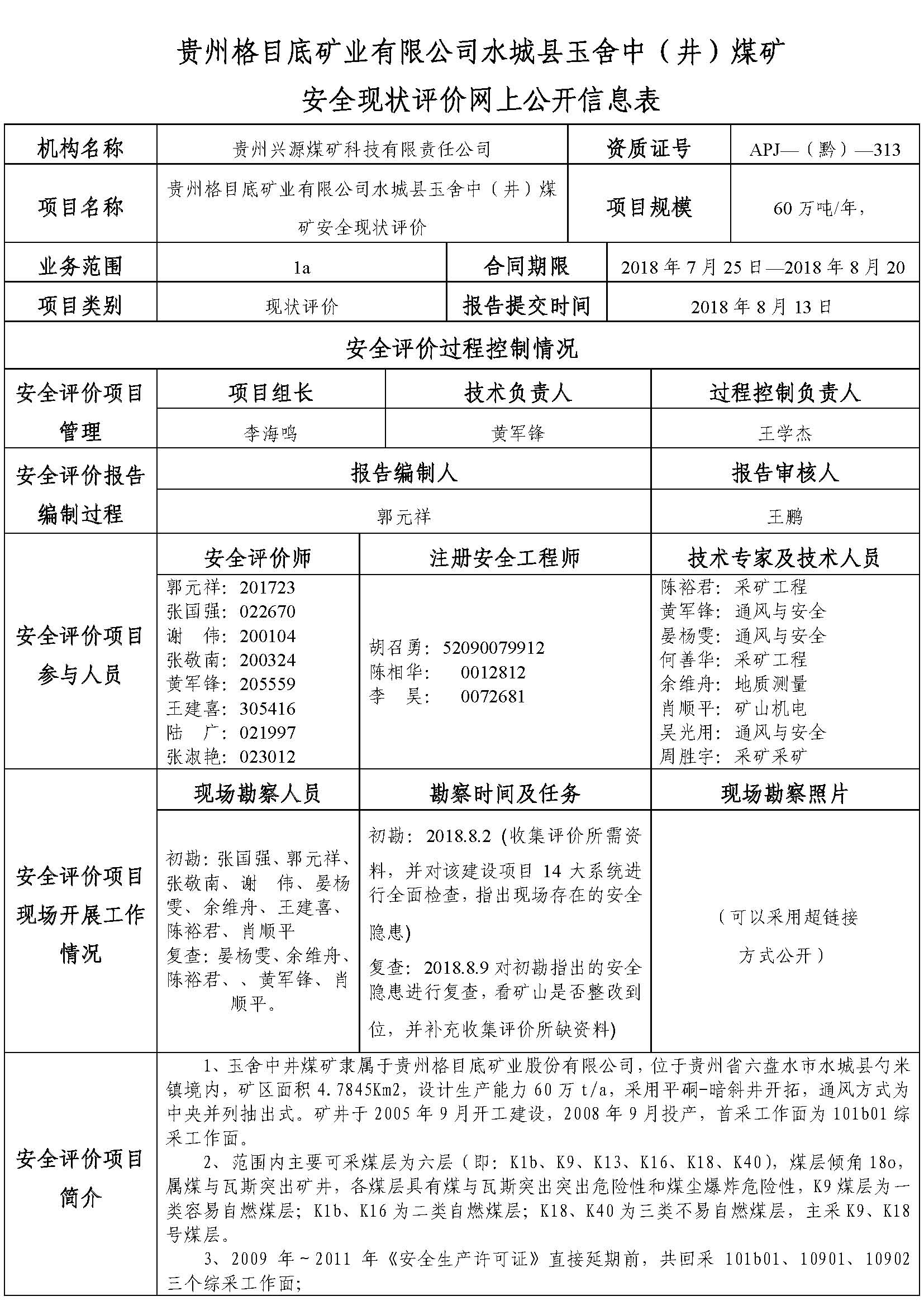 貴州格目底礦業有限公司水城縣玉舍中(井)煤礦安全現狀評價網上公開信息表