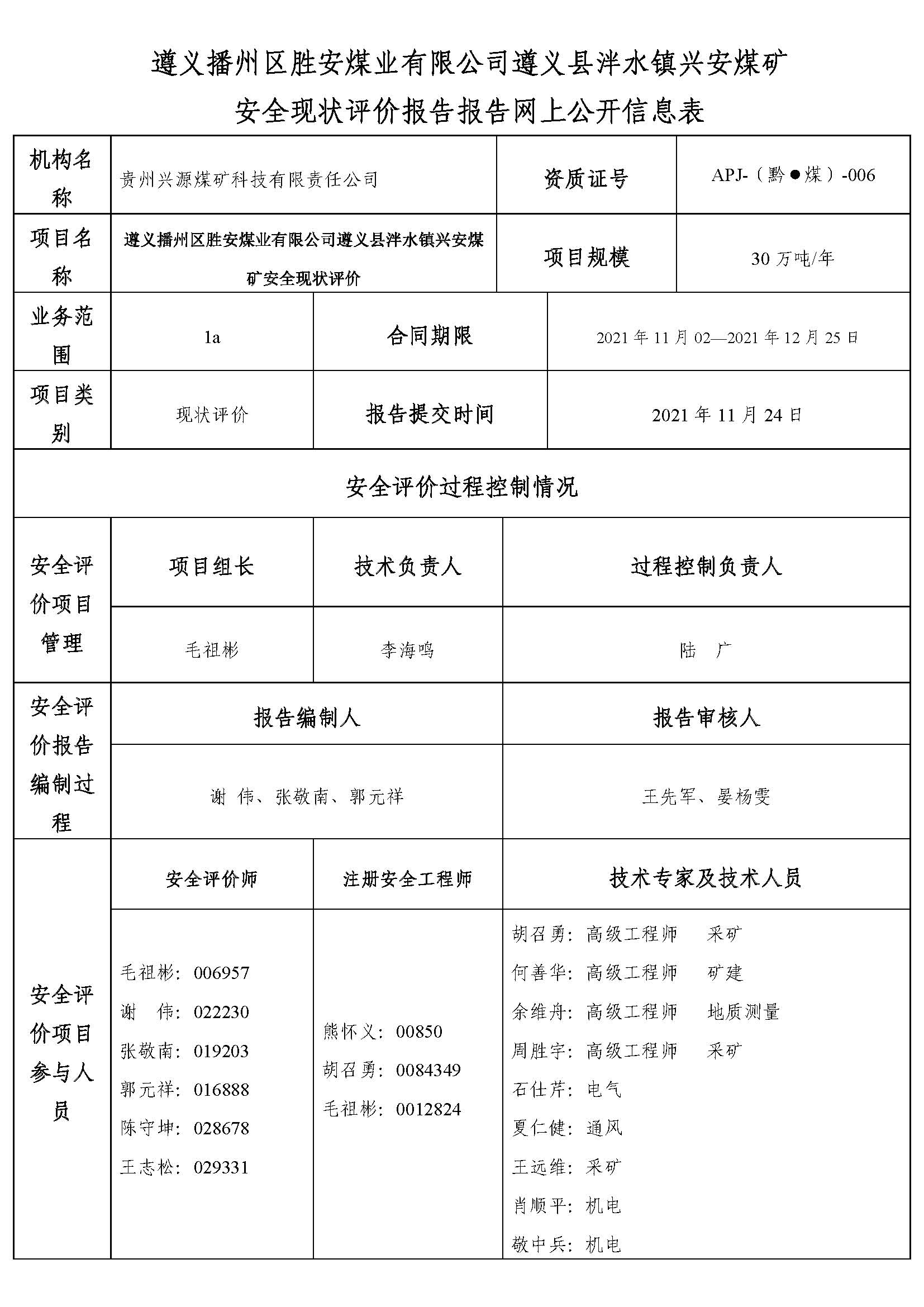 遵義播州區勝安煤業有限公司遵義縣泮水鎮興安煤礦 安全現狀評價報告報告網上公開信息表
