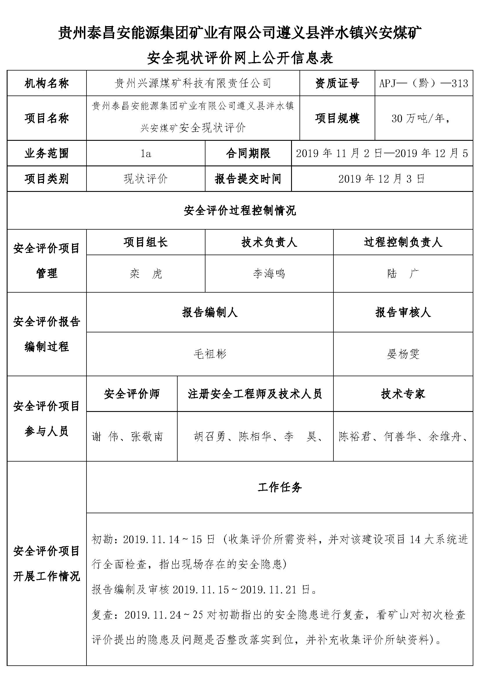 貴州泰昌安能源集團(tuán)礦業(yè)有限公司遵義縣泮水鎮(zhèn)興安煤礦安全現(xiàn)狀評價網(wǎng)上公開信息表
