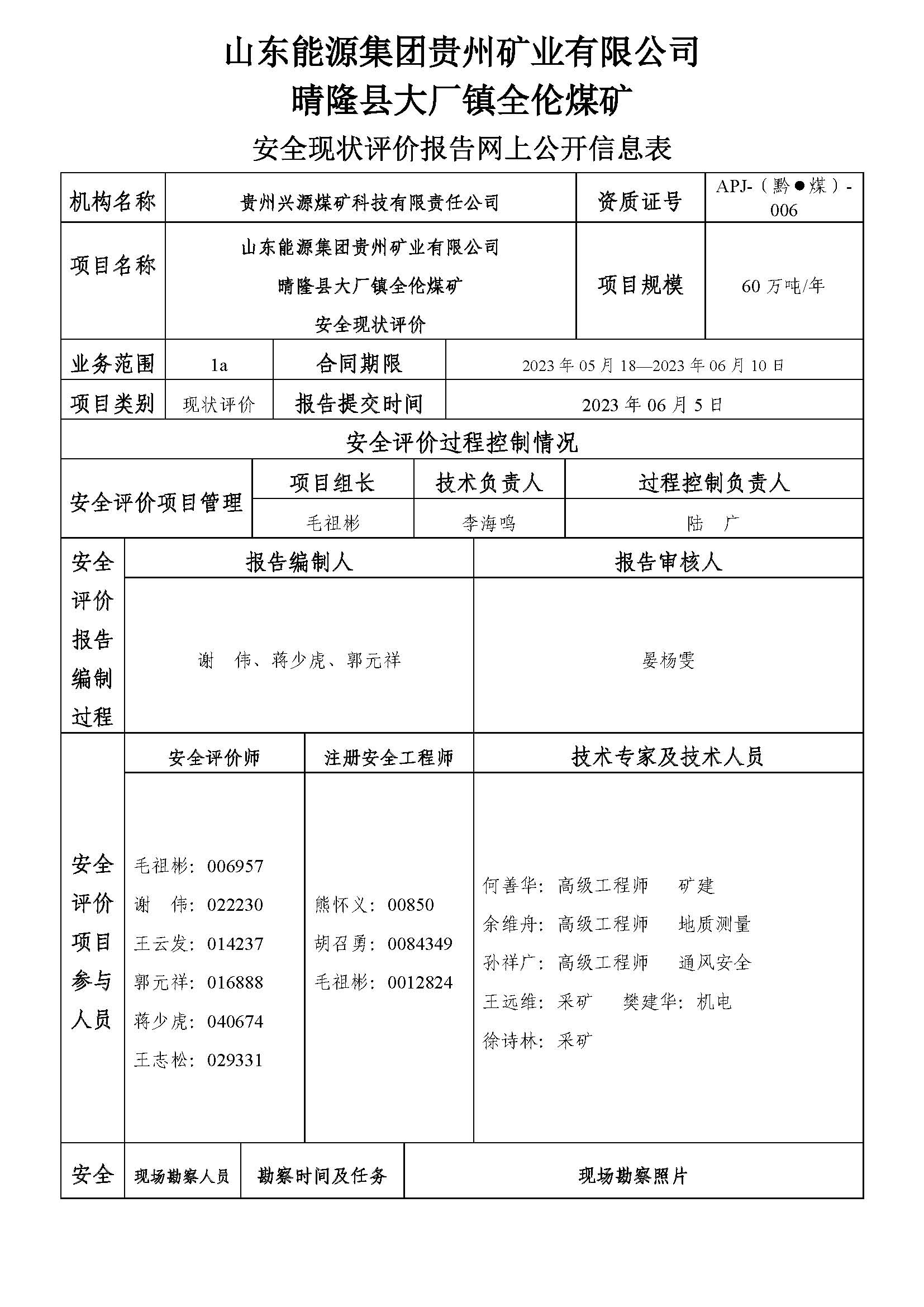 山東能源集團(tuán)貴州礦業(yè)有限公司 晴隆縣大廠鎮(zhèn)全倫煤礦 安全現(xiàn)狀評價(jià)報(bào)告網(wǎng)上公開信息表