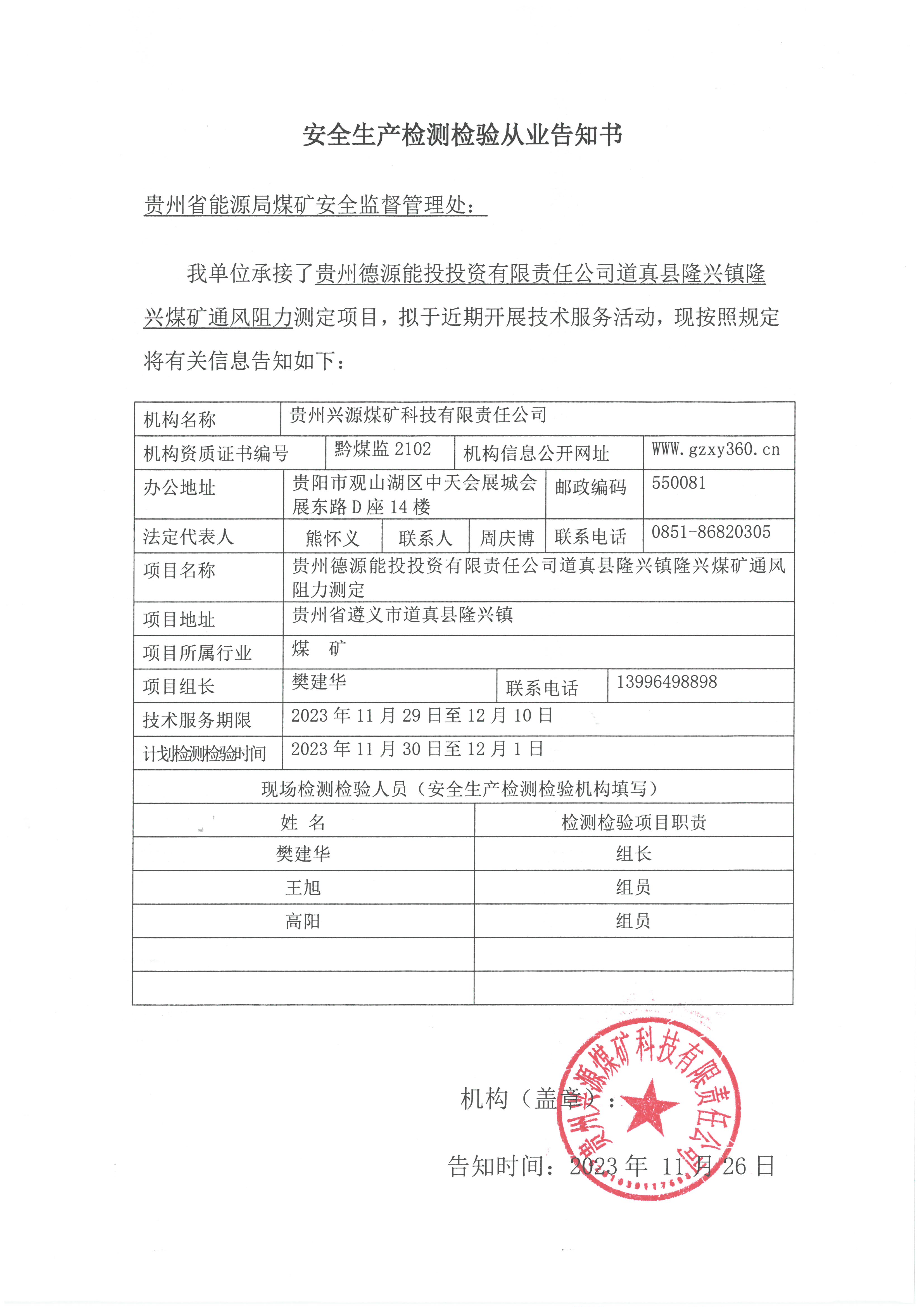 安全生產檢測檢驗從業告知書【貴州德源能投投資有限責任公司道真縣隆興鎮隆興煤礦通風阻力測定】