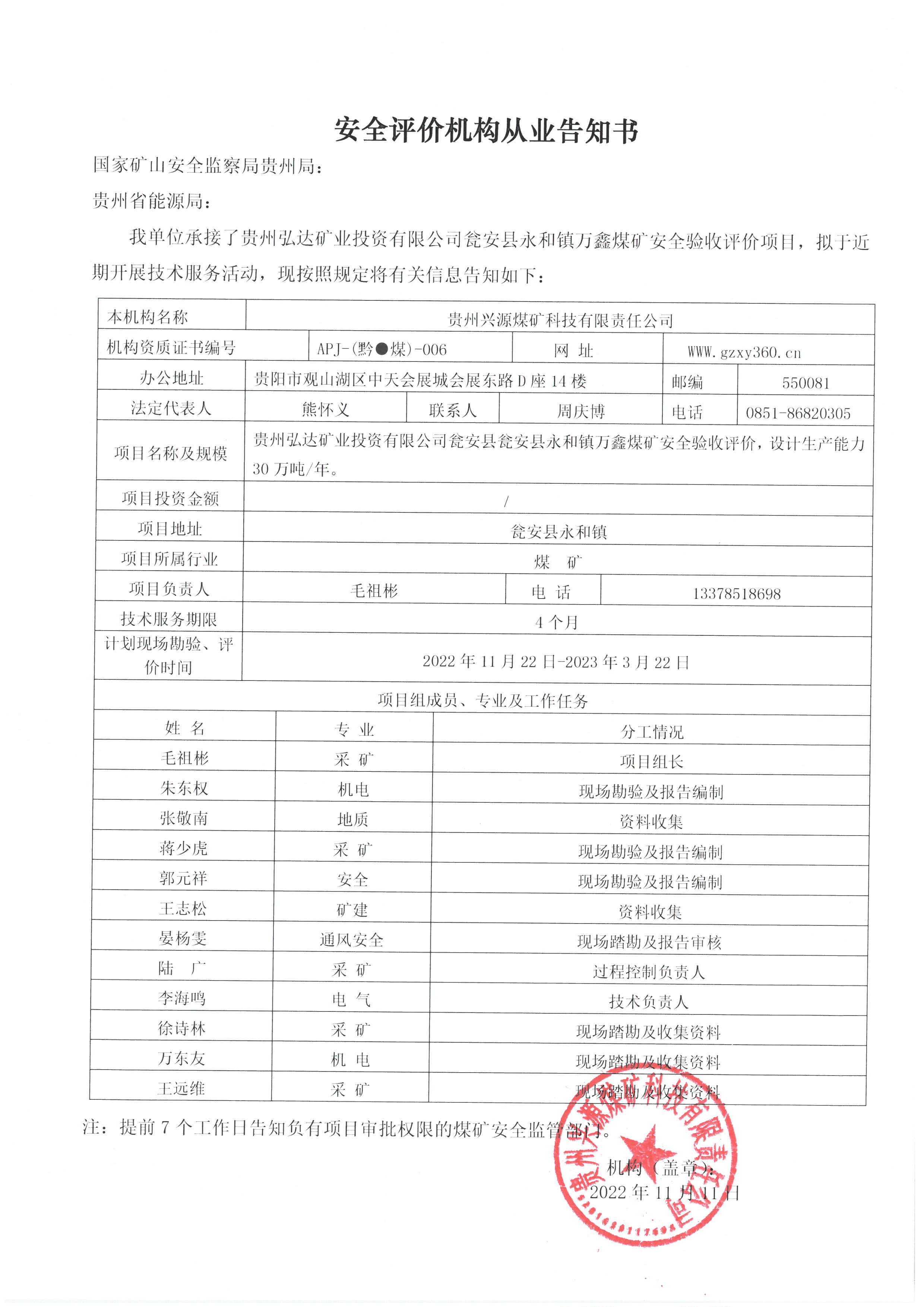 安全評價機構從業告知書【貴州弘達礦業投資有限公司甕安縣永和鎮萬鑫煤礦】