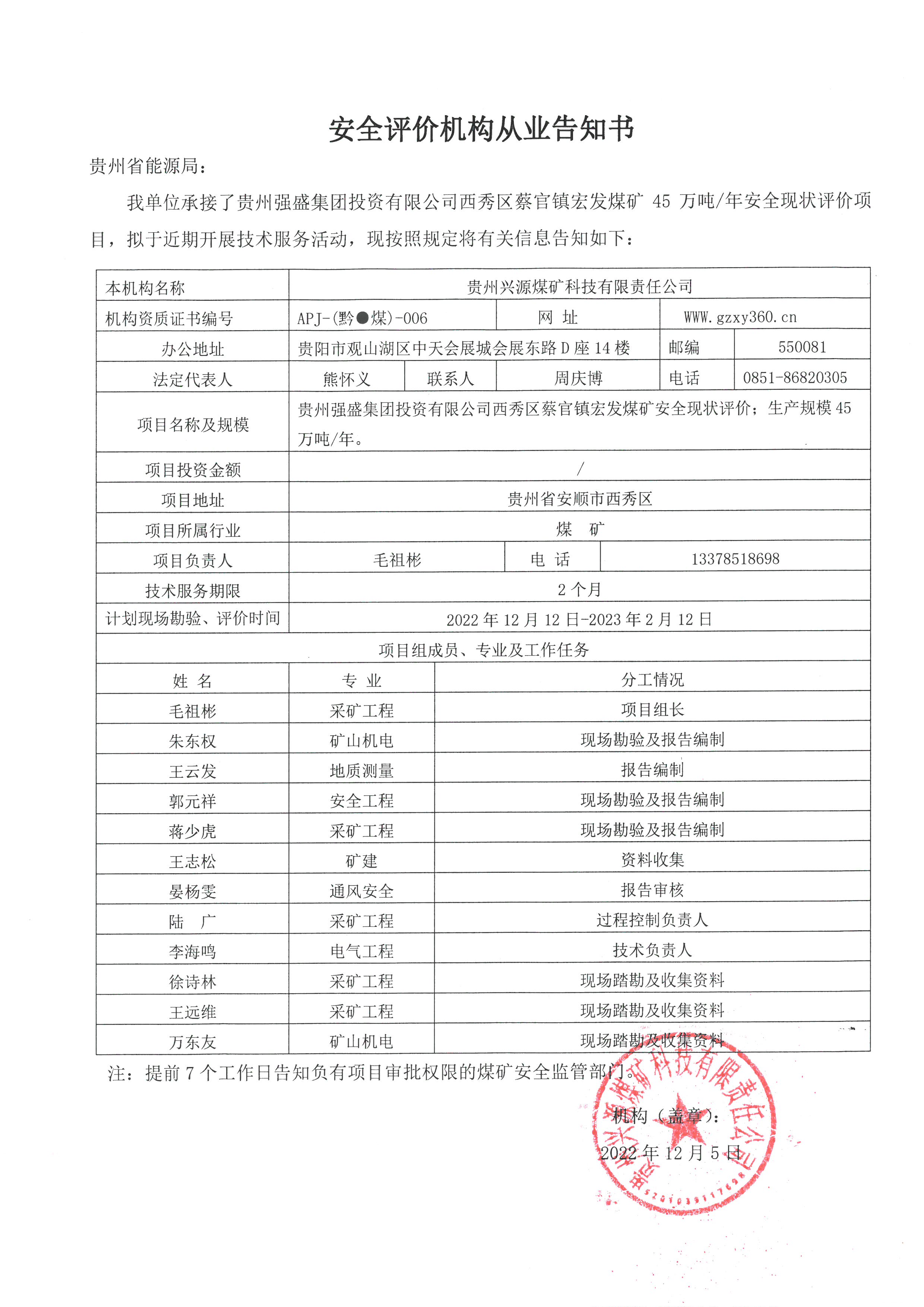 煤礦安全評(píng)價(jià)機(jī)構(gòu)從業(yè)告知書(shū)【貴州強(qiáng)盛集團(tuán)投資有限公司西秀區(qū)蔡官鎮(zhèn)宏發(fā)煤礦】