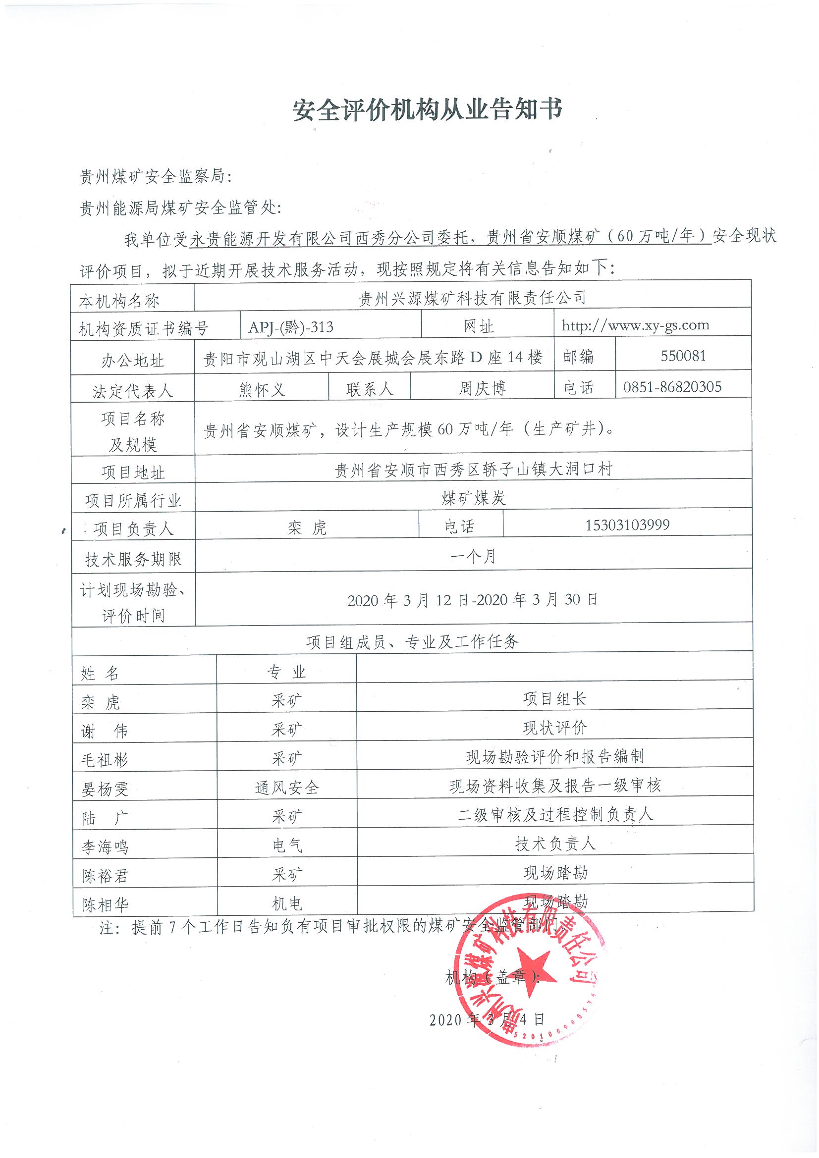 安全評(píng)價(jià)機(jī)構(gòu)從業(yè)告知書[永貴能源開(kāi)發(fā)有限公司西秀分公司貴州省安順煤礦(60萬(wàn)噸/年)安全現(xiàn)狀評(píng)價(jià)]