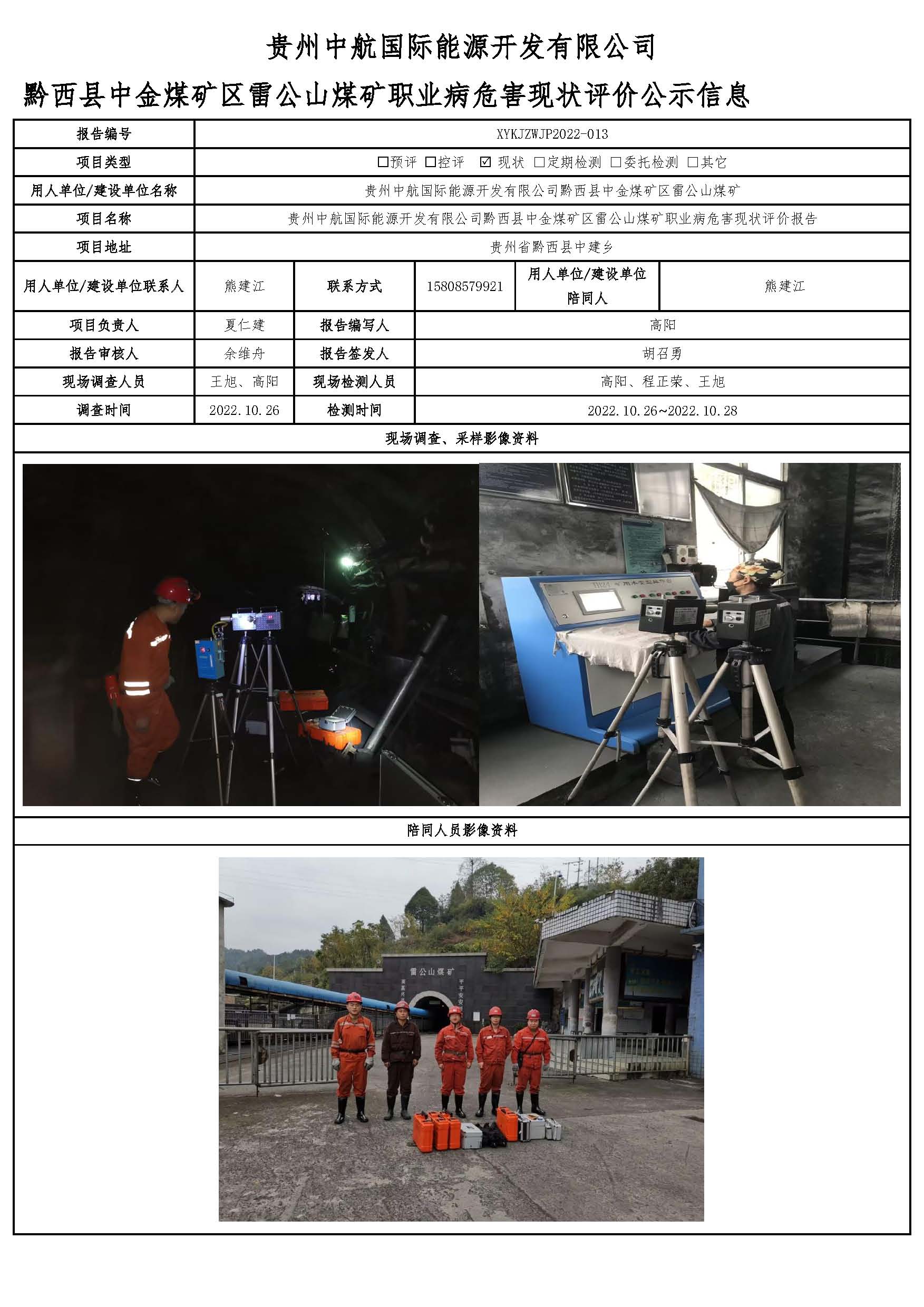 貴州中航國際能源開發有限公司 黔西縣中金煤礦區雷公山煤礦職業病危害現狀評價公示信息