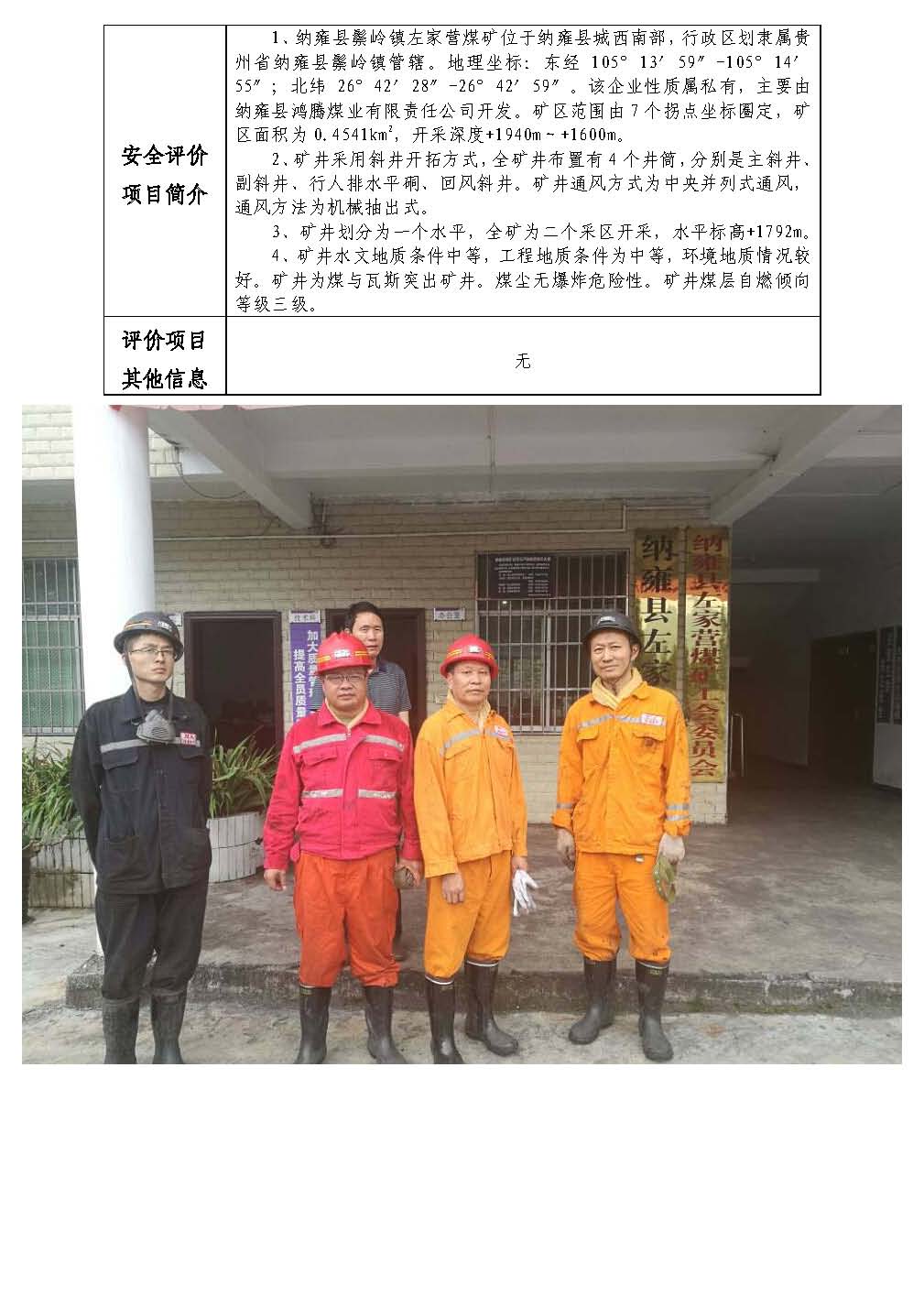 納雍縣鴻騰煤業投資有限責任公司納雍縣鬃嶺鎮左家營煤礦安全現狀評價網上公開信息表