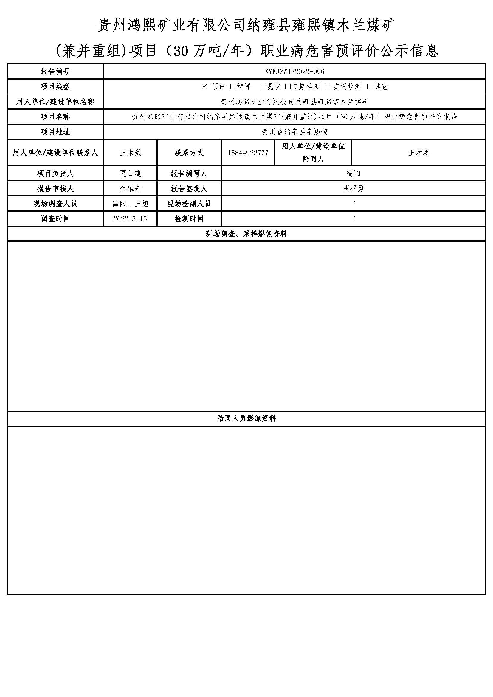貴州鴻熙礦業有限公司納雍縣雍熙鎮木蘭煤礦 (兼并重組)項目(30萬噸/年)職業病危害預評價公示信息