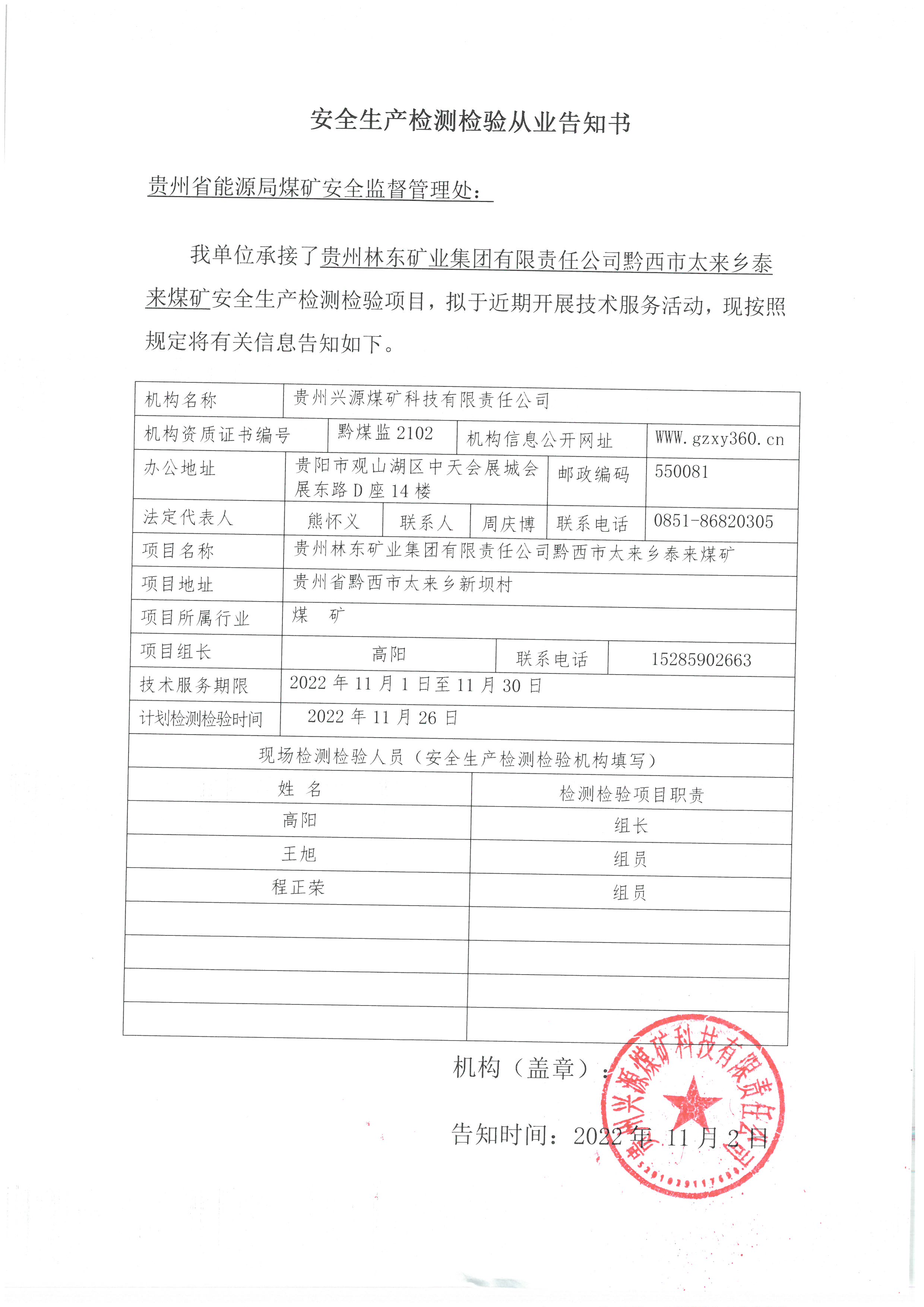安全生產(chǎn)檢測(cè)檢驗(yàn)從業(yè)告知書【貴州林東礦業(yè)集團(tuán)有限責(zé)任公司黔西市太來鄉(xiāng)泰來煤礦】
