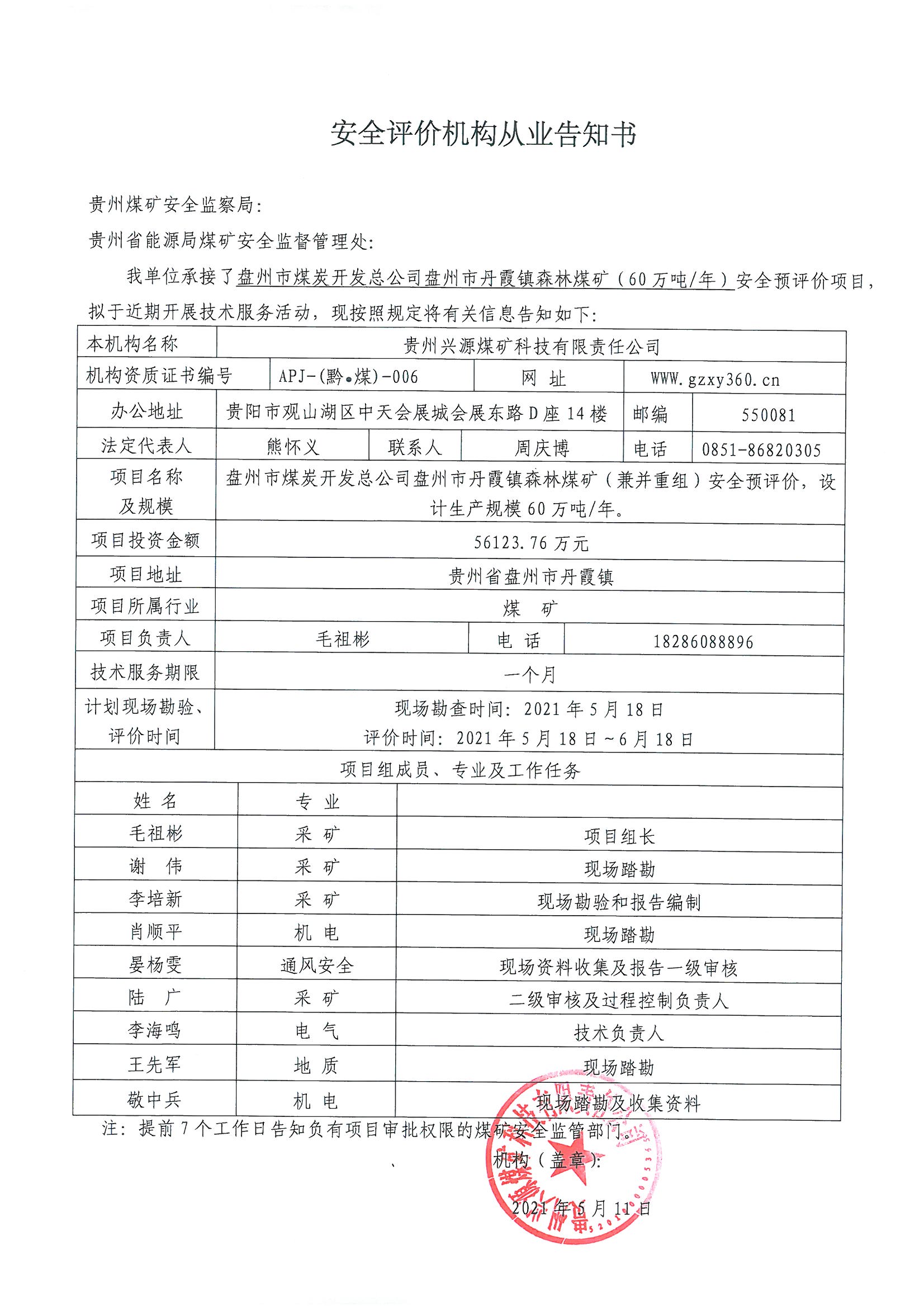 安全評價機構從業告知書(盤州市煤炭開發總公司盤州市丹霞鎮森林煤礦(60萬噸年)安全預評價)