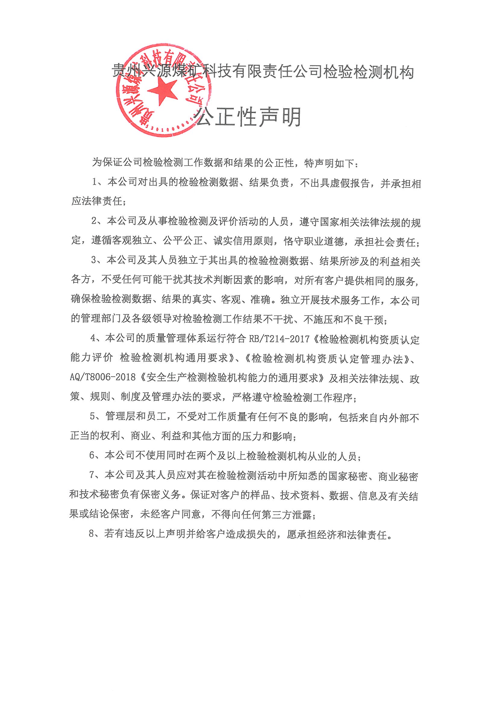 貴州興源煤礦科技有限責任公司檢驗檢測機構公正性聲明