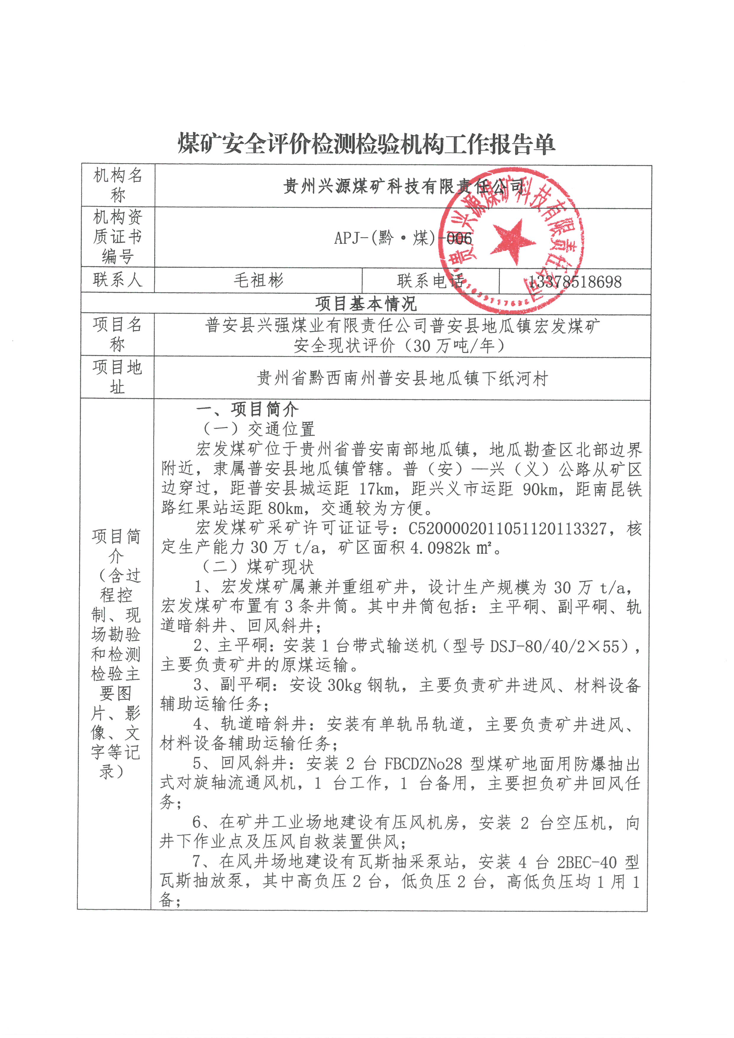 煤礦安全評價檢測檢驗機構(gòu)工作報告單【普安縣興強煤業(yè)有限責任公司普安縣地瓜鎮(zhèn)宏發(fā)煤礦安全現(xiàn)狀評價(30萬噸/年)】