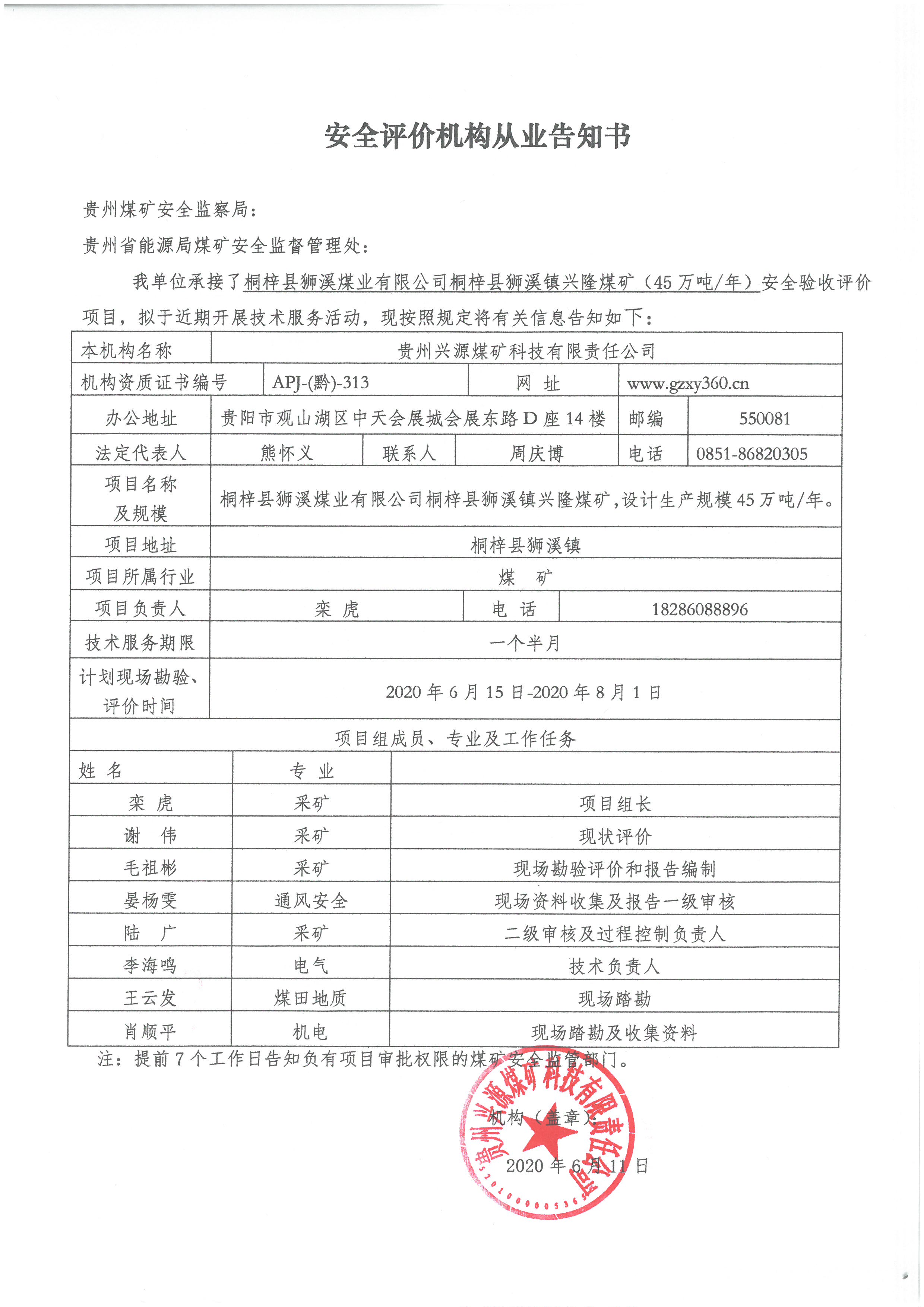 安全評價機構從業告知書【桐梓縣獅溪煤業有限公司桐梓縣獅溪鎮興隆煤礦(45萬噸/年)安全驗收評價】