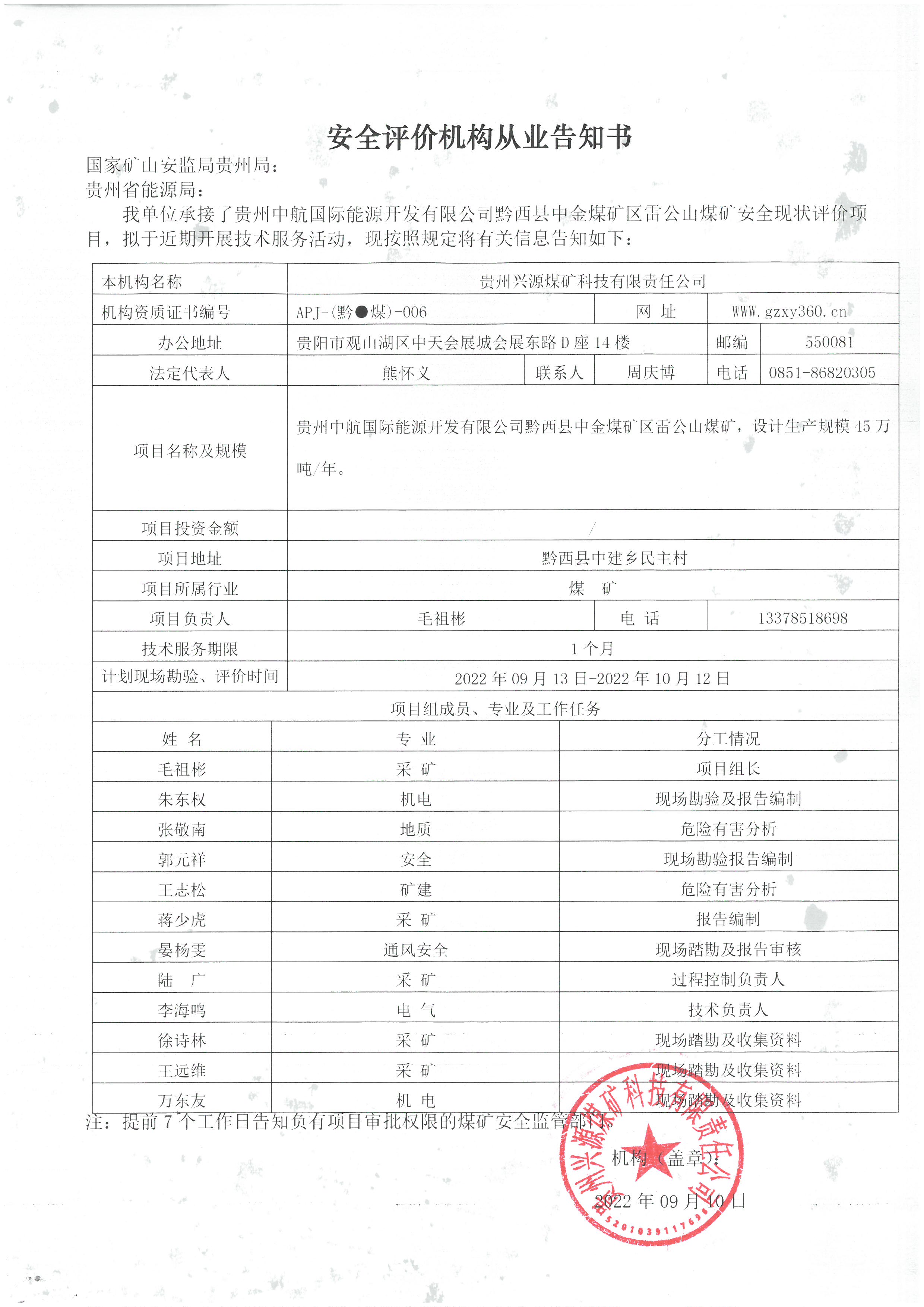 安全評價機構從業告知書(貴州中航國際能源開發有限公司黔西縣中金煤礦區雷公山煤礦安全現狀評價)