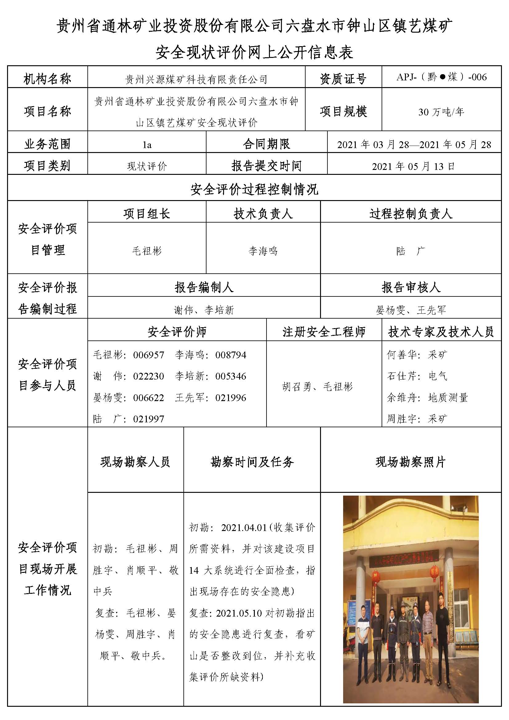 貴州省通林礦業(yè)投資股份有限公司六盤水市鐘山區(qū)鎮(zhèn)藝煤礦安全現(xiàn)狀評價網(wǎng)上公開信息表