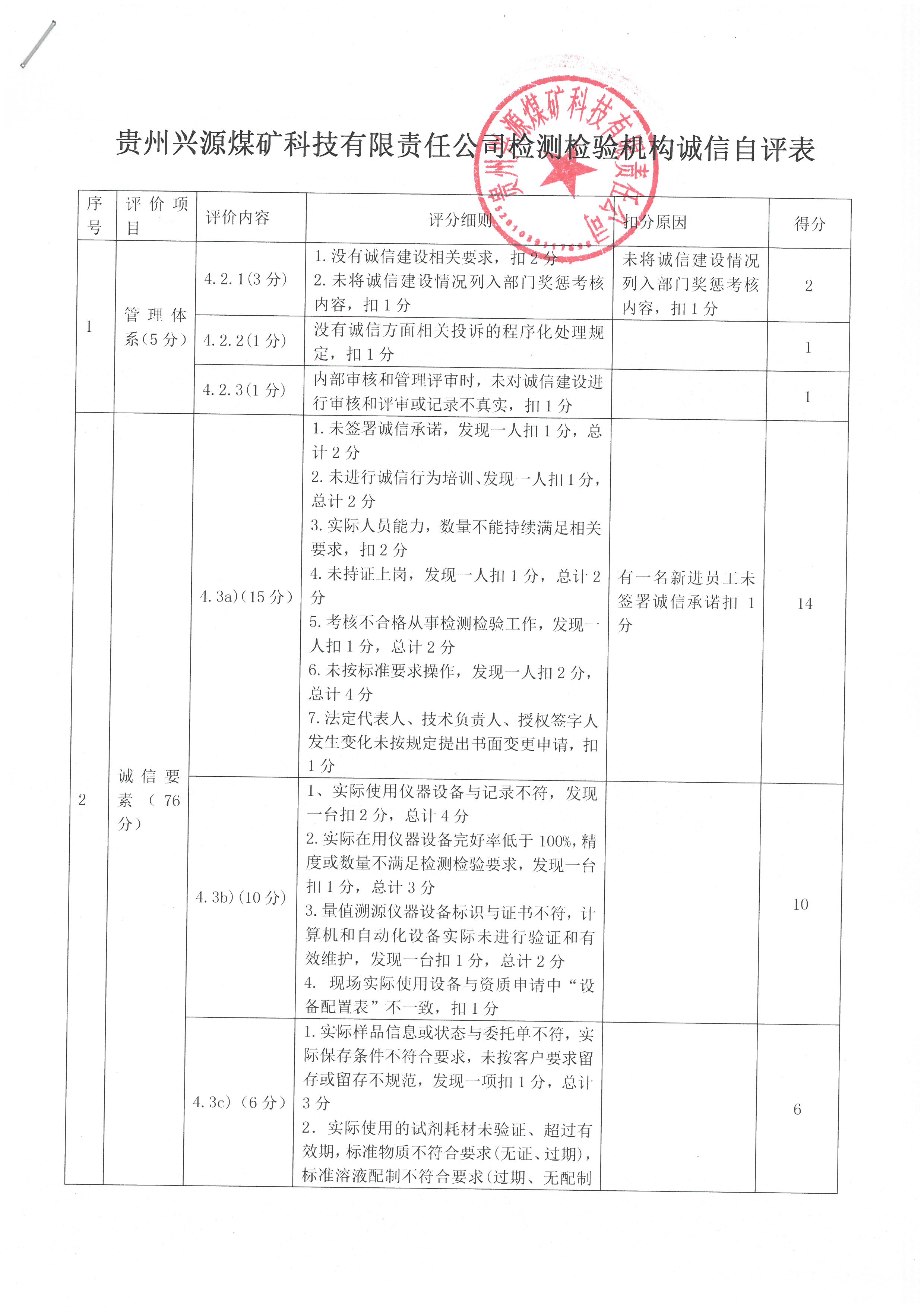 貴州興源煤礦科技有限責任公司檢測檢驗機構誠信自評表