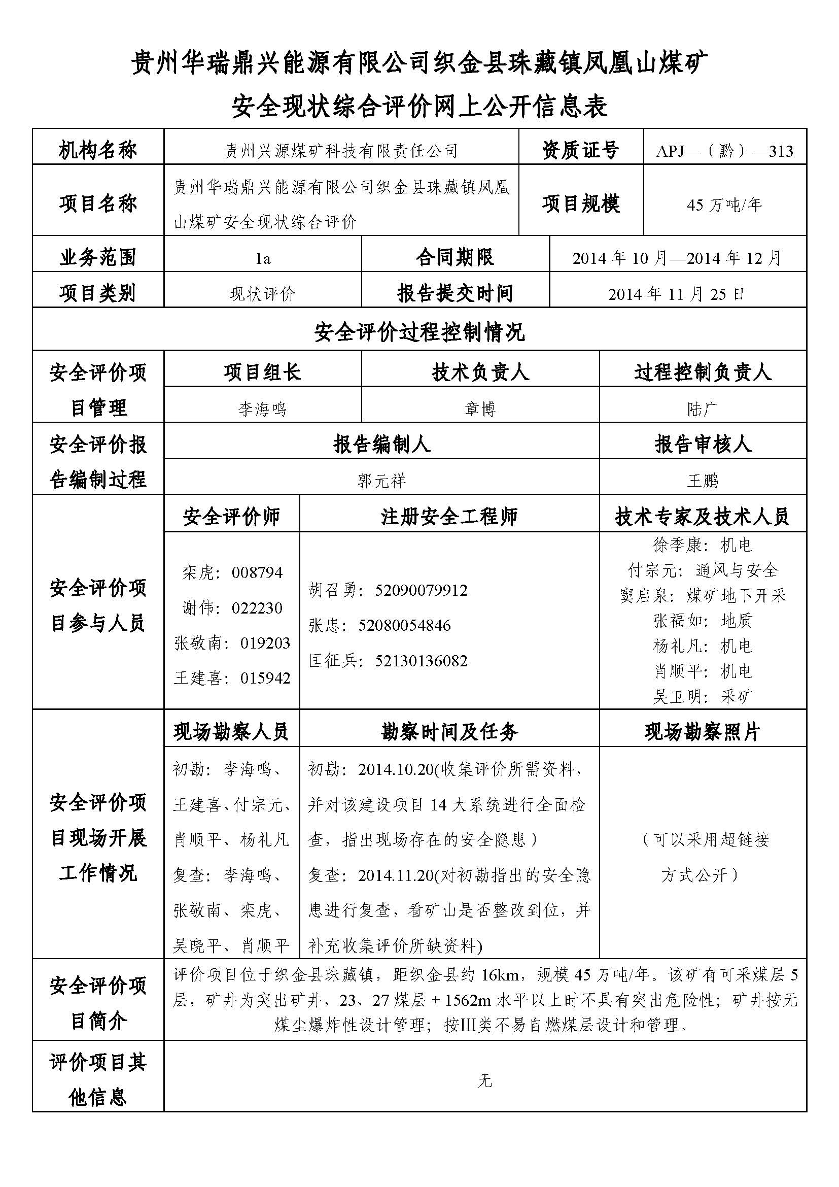 貴州華瑞鼎興能源有限公司織金縣珠藏鎮(zhèn)鳳凰山煤礦安全評價業(yè)務(wù)網(wǎng)上公開信息表
