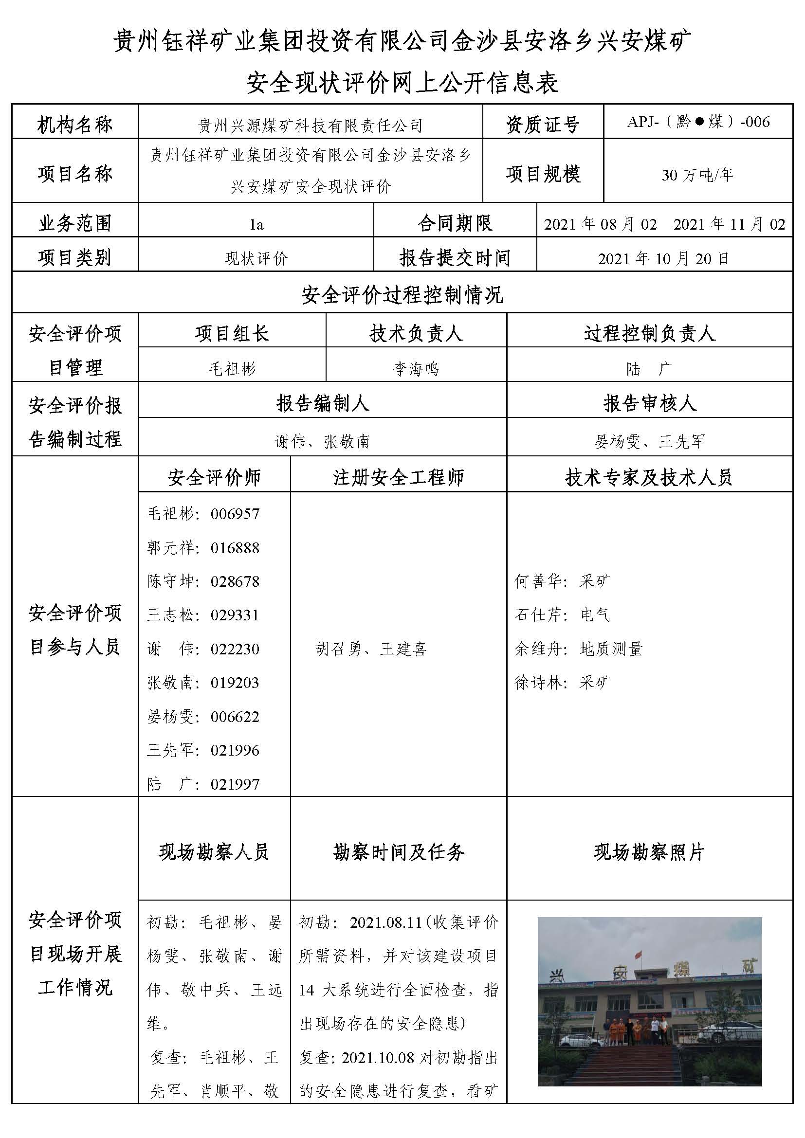 貴州鈺祥礦業(yè)集團投資有限公司金沙縣安洛鄉(xiāng)興安煤礦安全現(xiàn)狀評價網(wǎng)上公開信息表