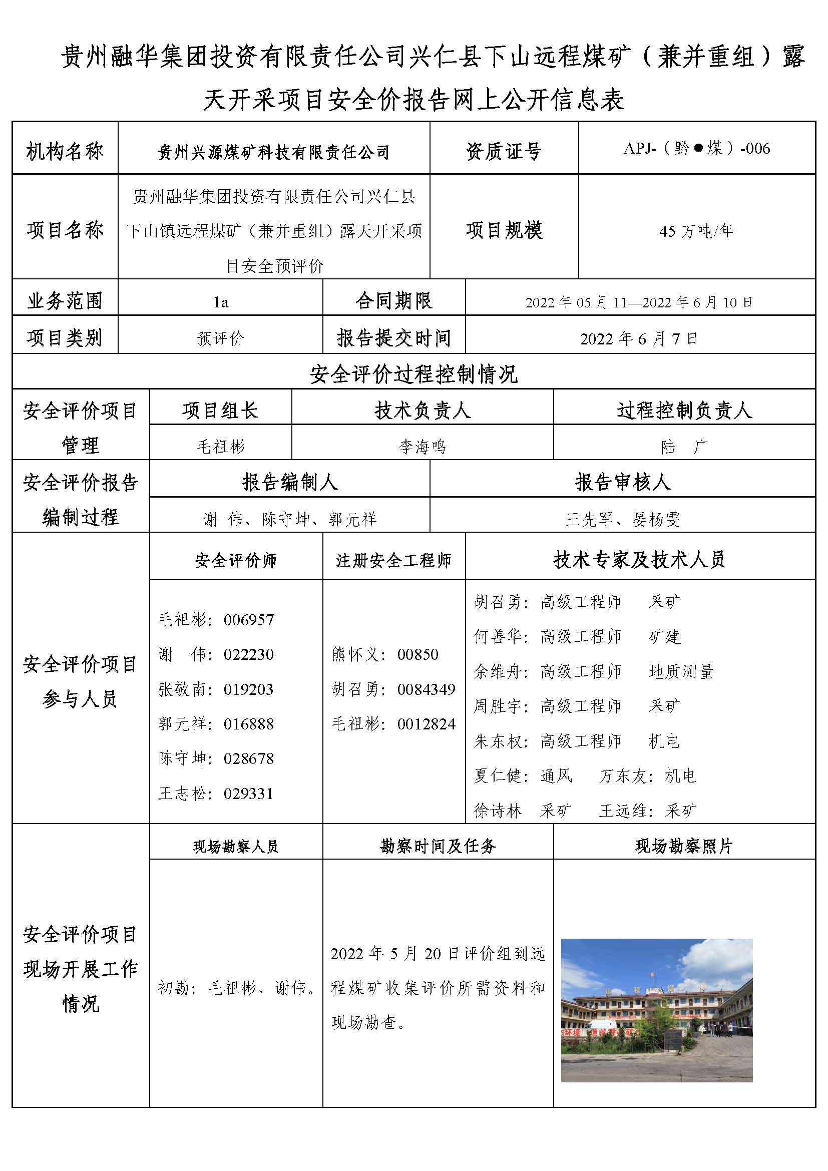 貴州融華集團投資有限責任公司興仁縣下山遠程煤礦(兼并重組)露天開采項目安全價報告網上公開信息表