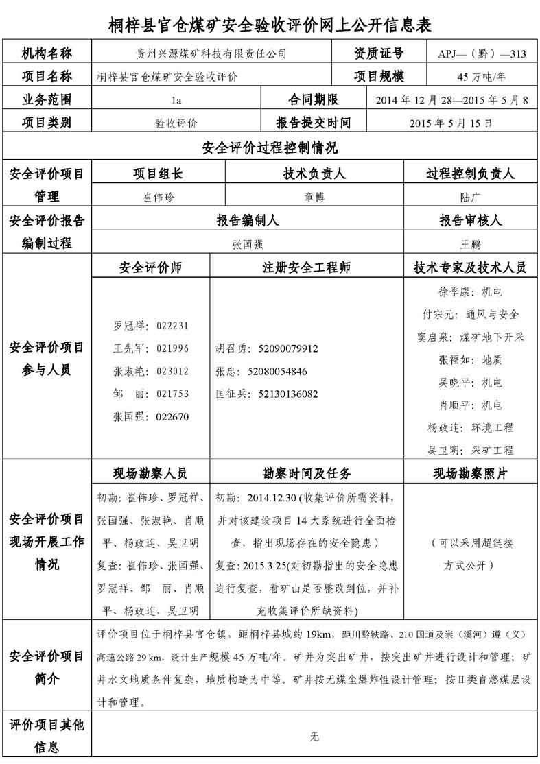 桐梓縣官倉煤礦安全評價業務網上公開信息表