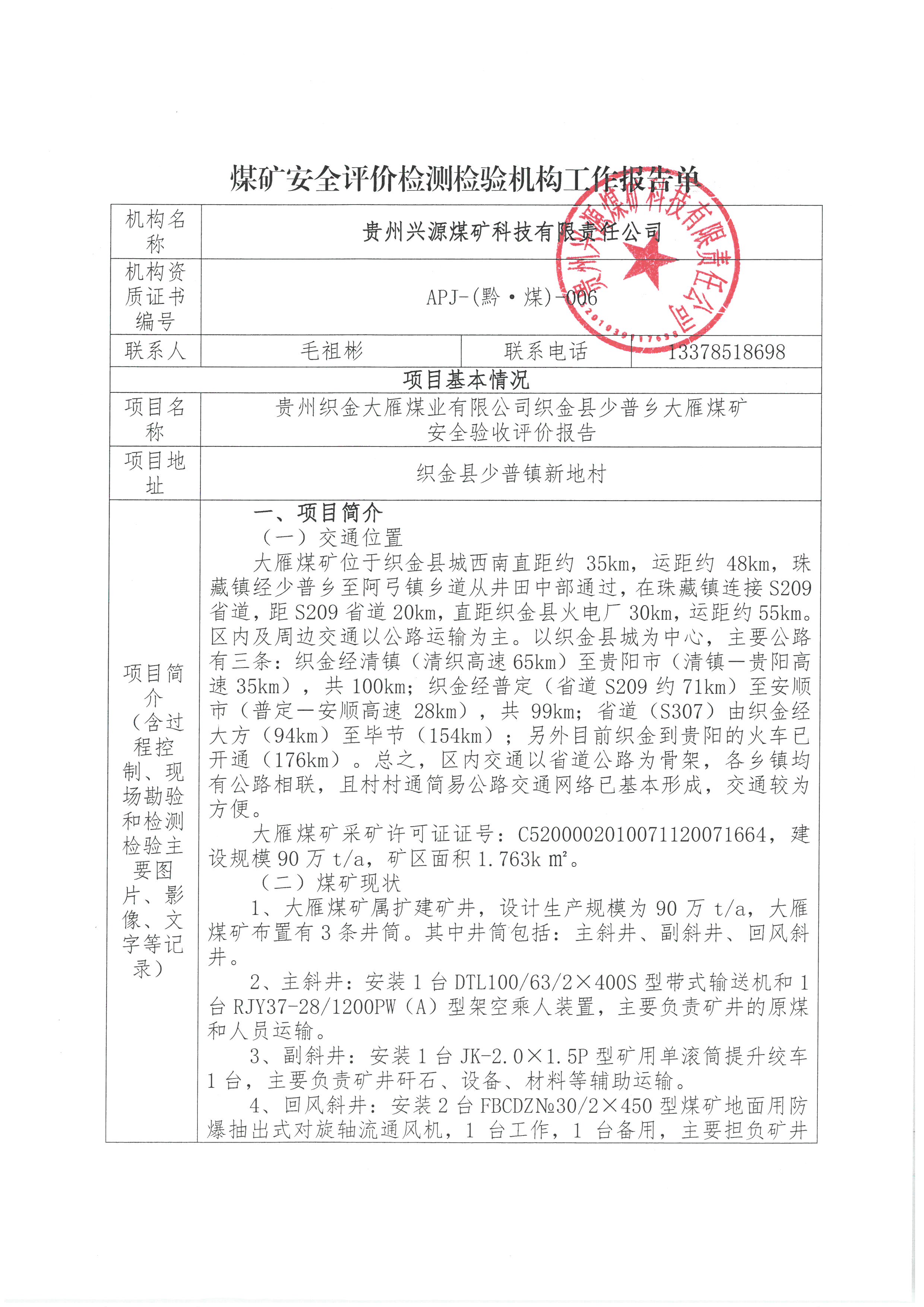 煤礦安全評價檢測檢驗機構工作報告單【貴州織金大雁煤業有限公司織金縣少普鄉大雁煤礦安全驗收評價報告】