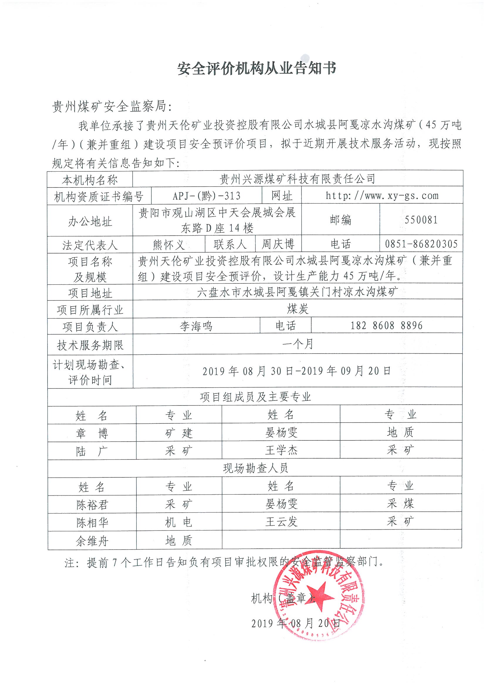 安全評價機構從業告知書【貴州天倫礦業投資控股有限公司水城縣阿戛涼水溝煤礦】