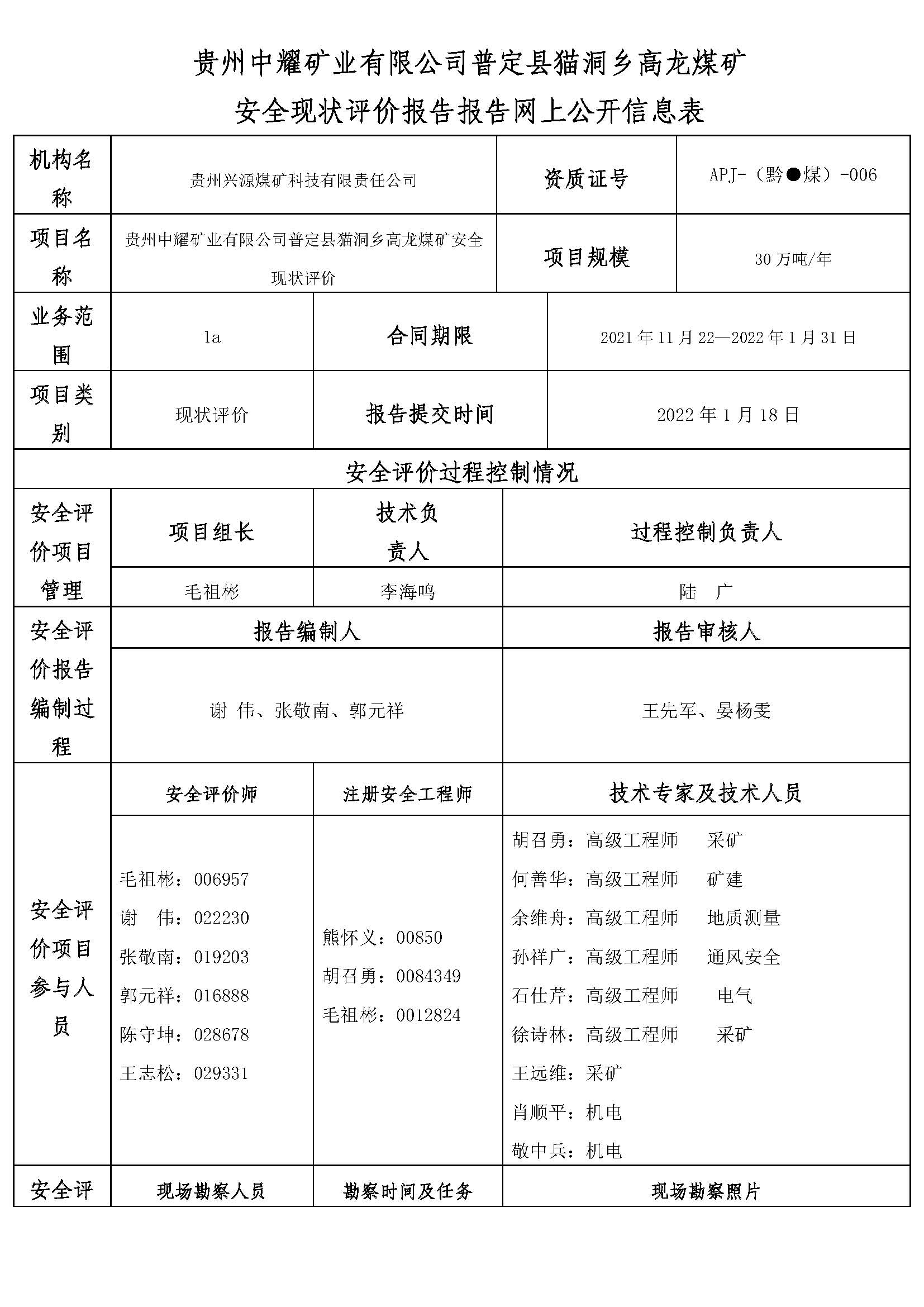 貴州中耀礦業有限公司普定縣貓洞鄉高龍煤礦 安全現狀評價報告報告網上公開信息表