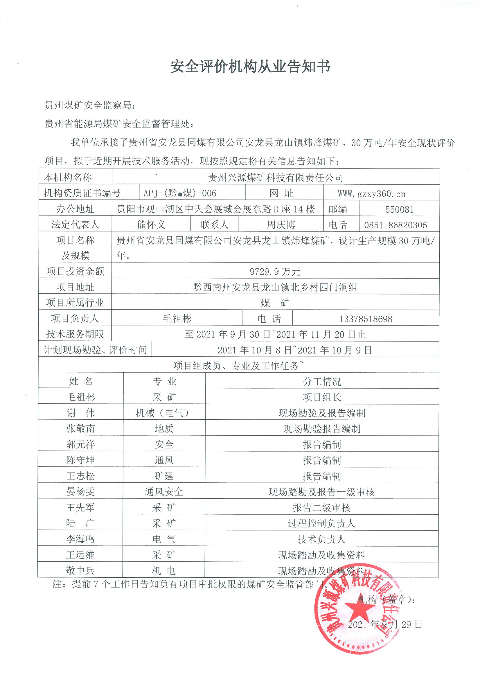 安全評價機構從業告知書(貴州省安龍縣同煤有限公司安龍縣龍山鎮煒烽煤礦)