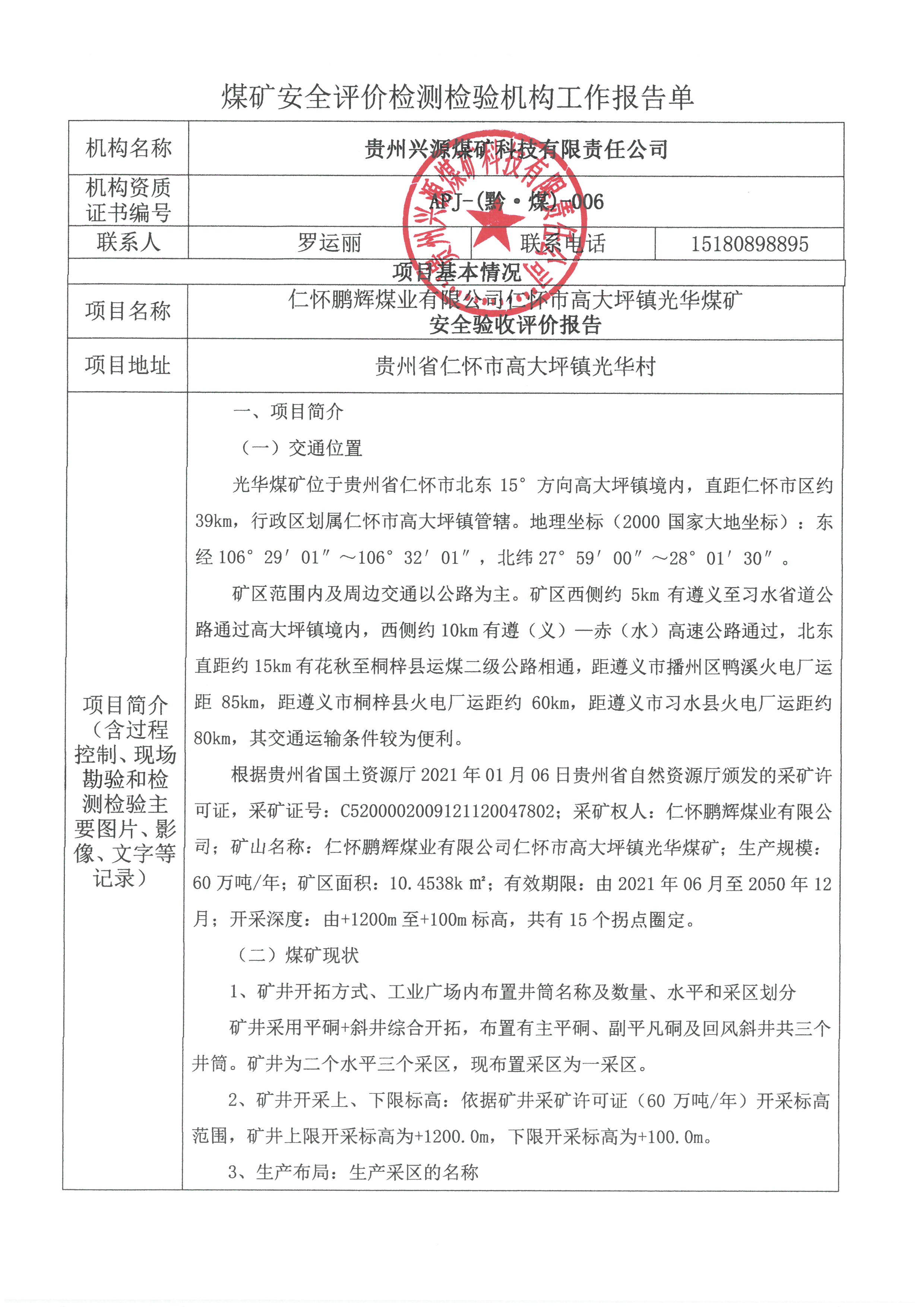 煤礦安全評價檢測檢驗機構工作報告單【仁懷鵬輝煤業有限公司仁懷市高大坪鎮光華煤礦安全驗收評價報告】