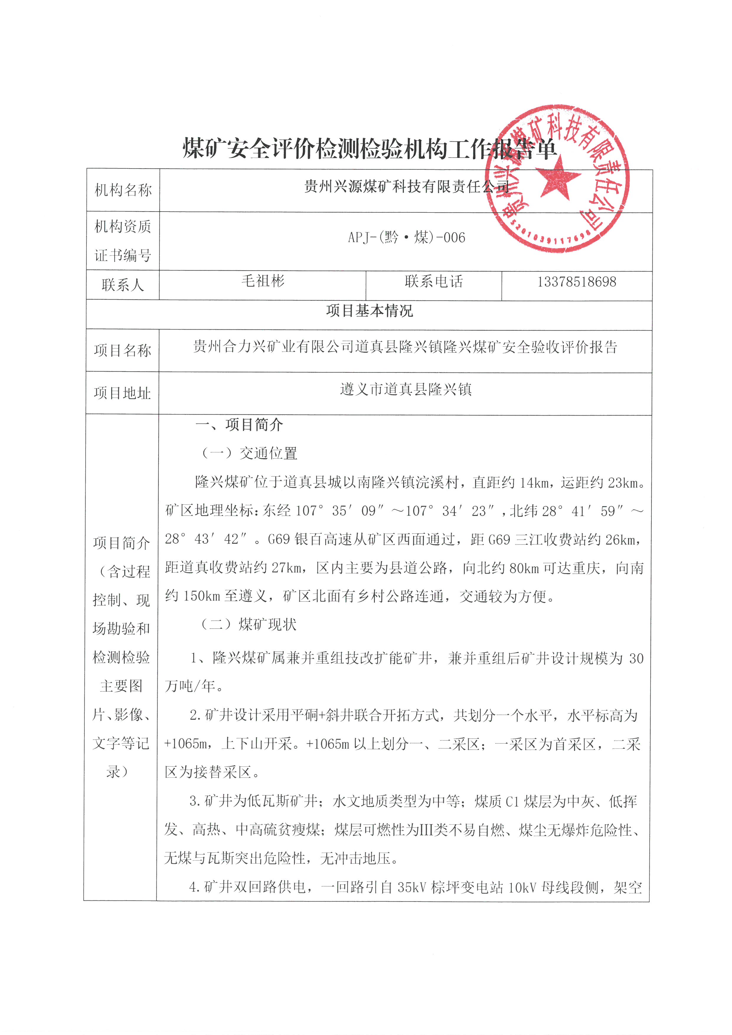 煤礦安全評(píng)價(jià)檢測檢驗(yàn)機(jī)構(gòu)工作報(bào)告單【貴州合力興礦業(yè)有限公司道真縣隆興鎮(zhèn)隆興煤礦安全驗(yàn)收評(píng)價(jià)報(bào)告】