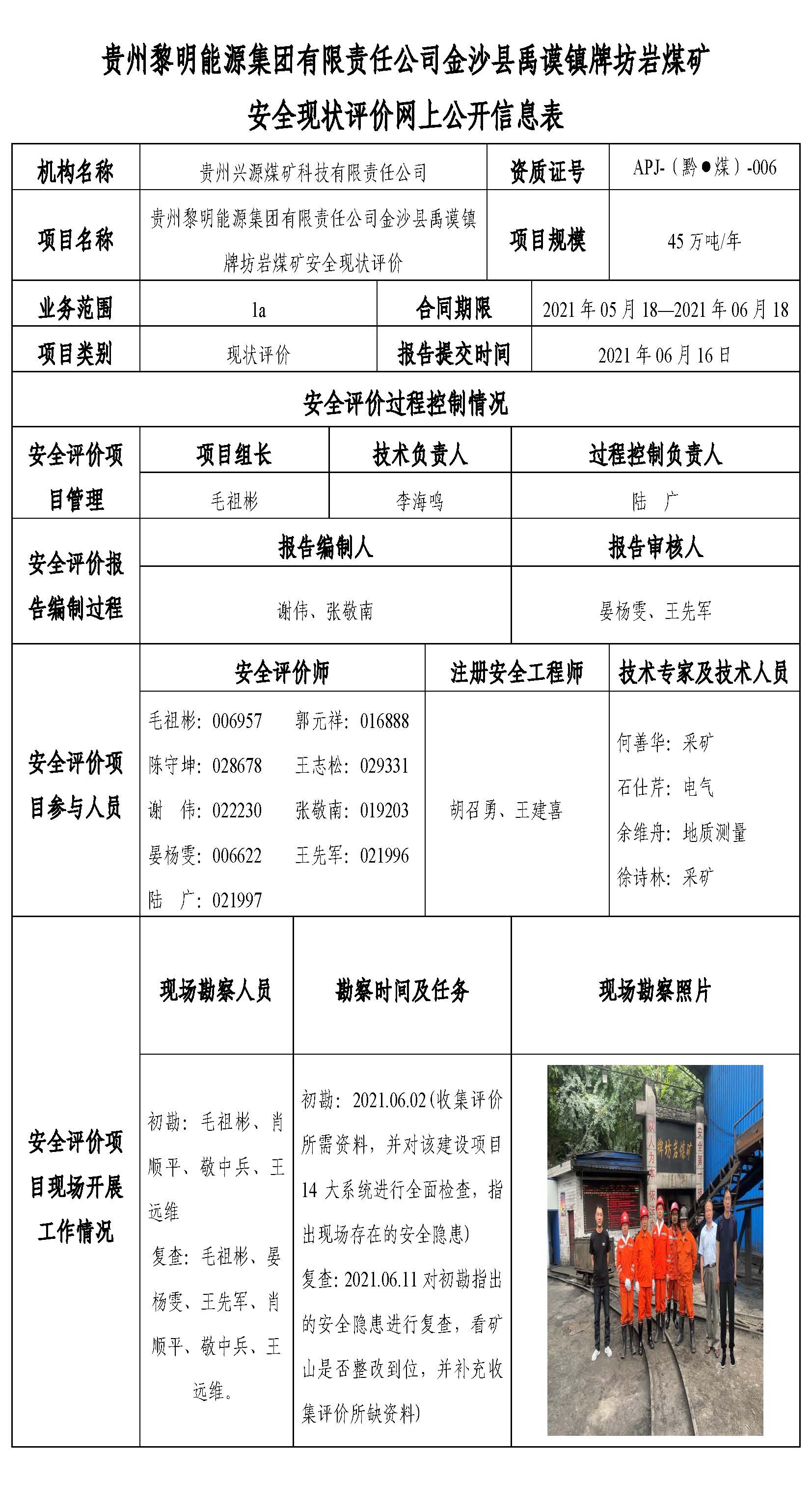 貴州黎明能源集團有限責任公司金沙縣禹謨鎮(zhèn)牌坊巖煤礦安全現(xiàn)狀評價網(wǎng)上公開信息表