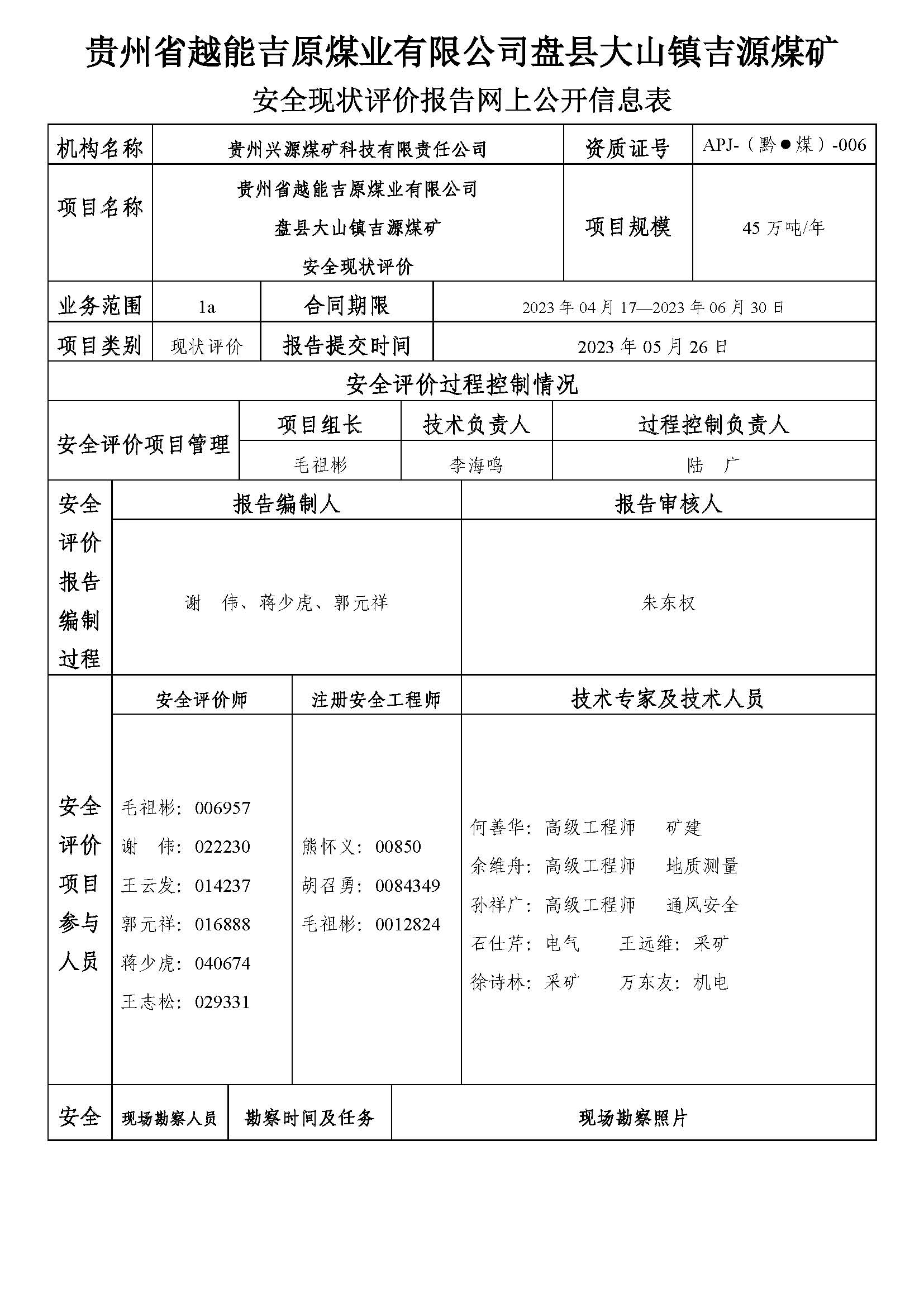 貴州省越能吉原煤業(yè)有限公司盤縣大山鎮(zhèn)吉源煤礦安全現(xiàn)狀評價報告網(wǎng)上公開信息表