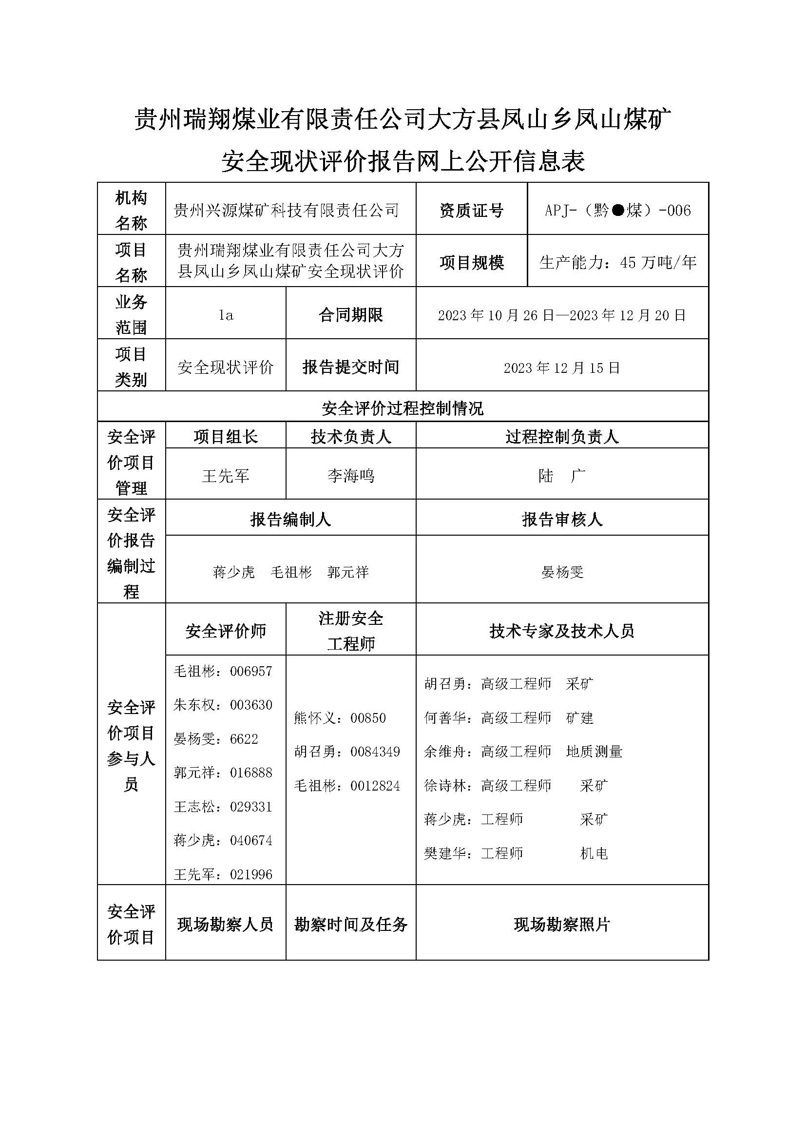 貴州瑞翔煤業(yè)有限責(zé)任公司大方縣鳳山鄉(xiāng)鳳山煤礦安全現(xiàn)狀評價報(bào)告網(wǎng)上公開信息表