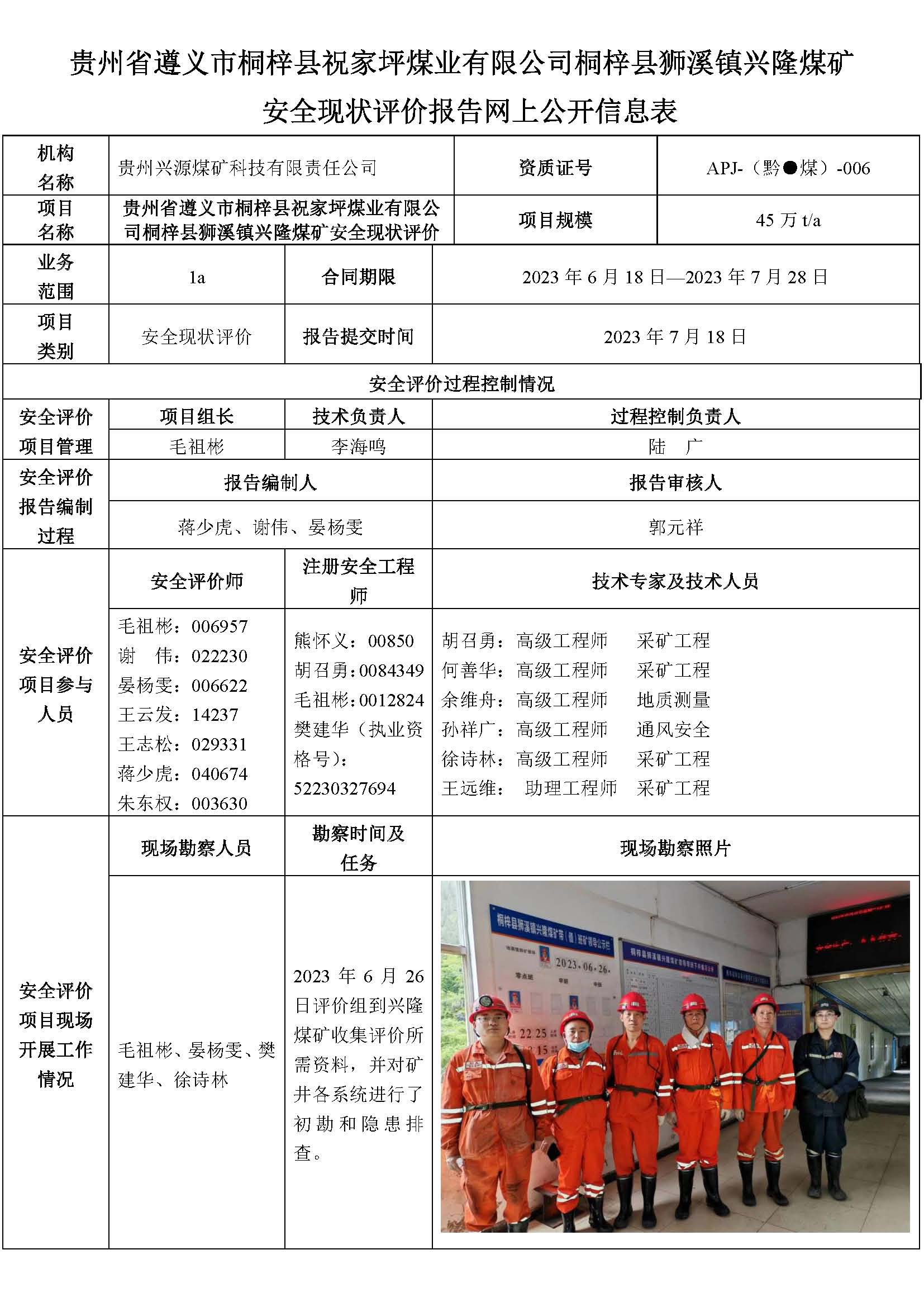 貴州省遵義市桐梓縣祝家坪煤業有限公司桐梓縣獅溪鎮興隆煤礦 安全現狀評價報告網上公開信息表